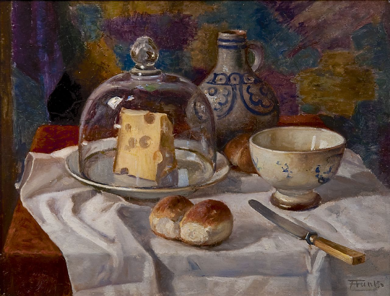 Anton Funke Kunstwerk • Gemälde • zuvor zu verkaufen A still life with a cheese cover, a bowl and rolls