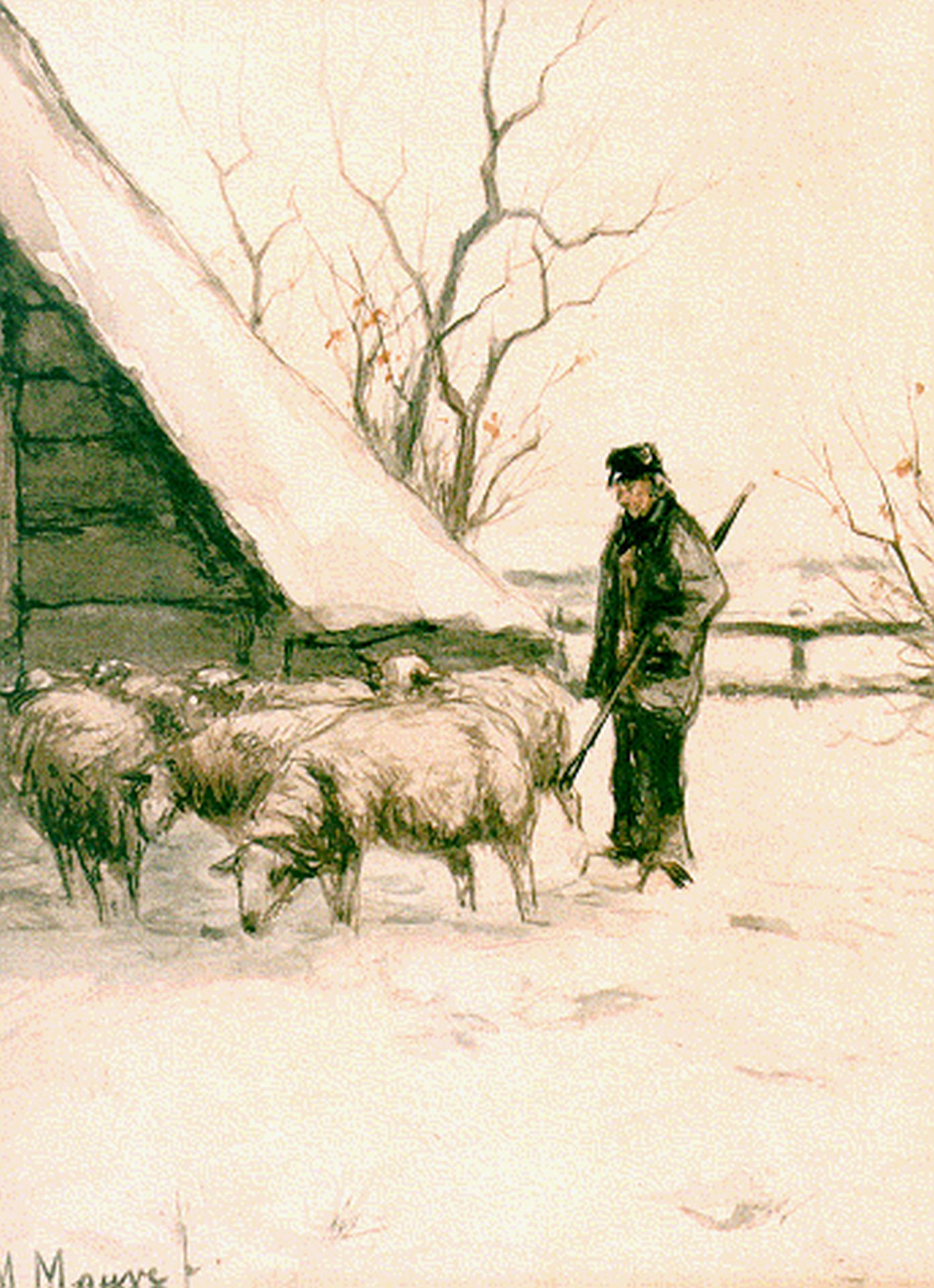 Anton Mauve Kunstwerk • Aquarell • Zeichnung • zuvor zu verkaufen A shepherd and flock in a snow-covered landscape
