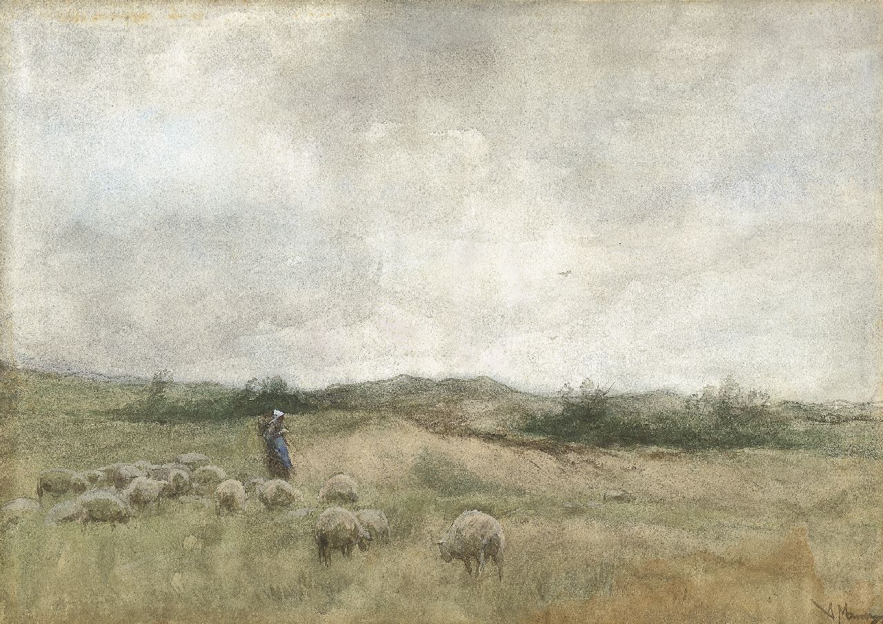 Anton Mauve Kunstwerk • Aquarell • Zeichnung • zuvor zu verkaufen A shepherdess tending to her flock