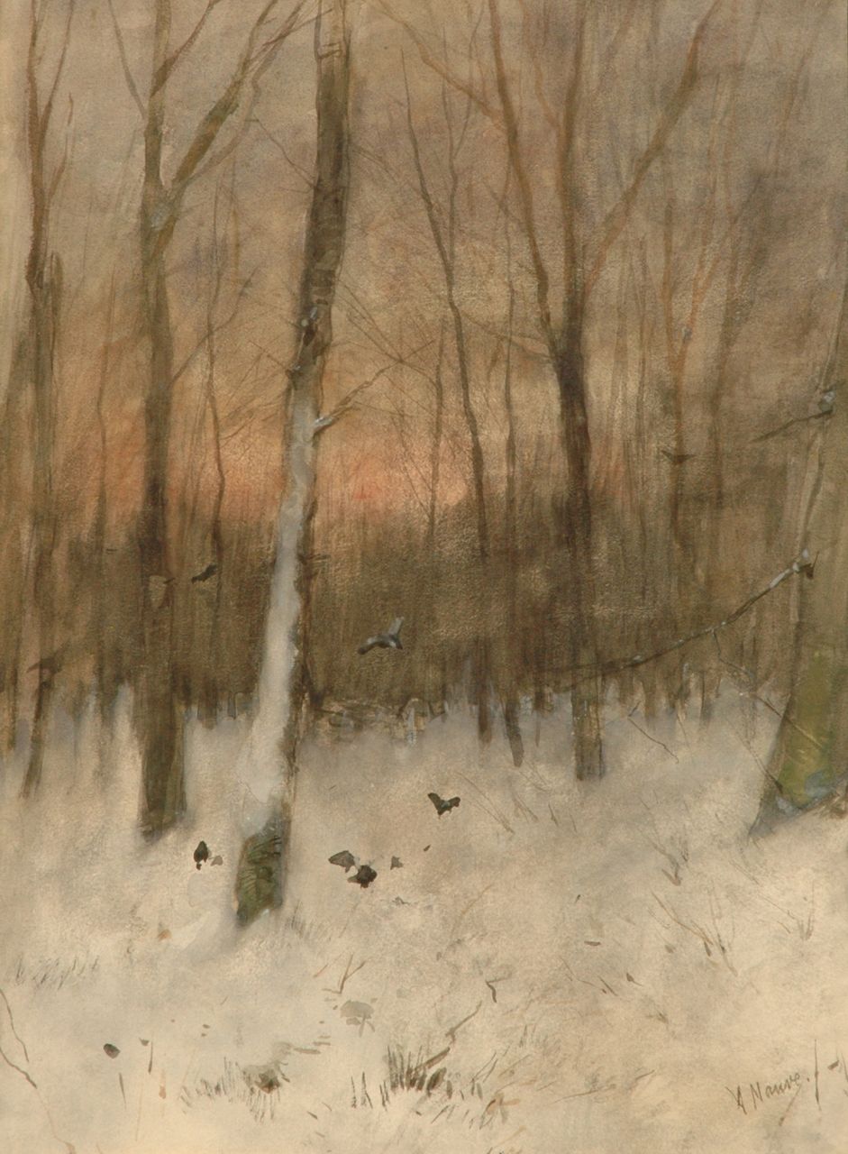 Anton Mauve Kunstwerk • Aquarell • Zeichnung • zuvor zu verkaufen A snowy forest at sunset