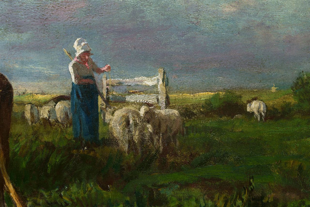 Anton Mauve ist einer der bekanntesten Maler der Haagse School. Er bekam seine Ausbildung bei den Tiermalern P.F.van Os und Wouterus Verschuur. Er arbeitete einige Zeit in Oosterbeek mit P.J.C. Gabriel. Er kombinierte Landschaften und Tiere in seinen Gemälden. Nach einigen Umherschweifungen liess er sich 1871 im Haag nieder. Nachher zog er nach Laren, wo er namentlich die Heide mit wolligen Schafsherden in silbergrauen Tönen der verfliessenden Landschaft wiedergab. Eine seiner geliebtesten Stellen war ein gerade ausserhalb Laren gelegenes Stück Ödland, später Mauvezand genannt.