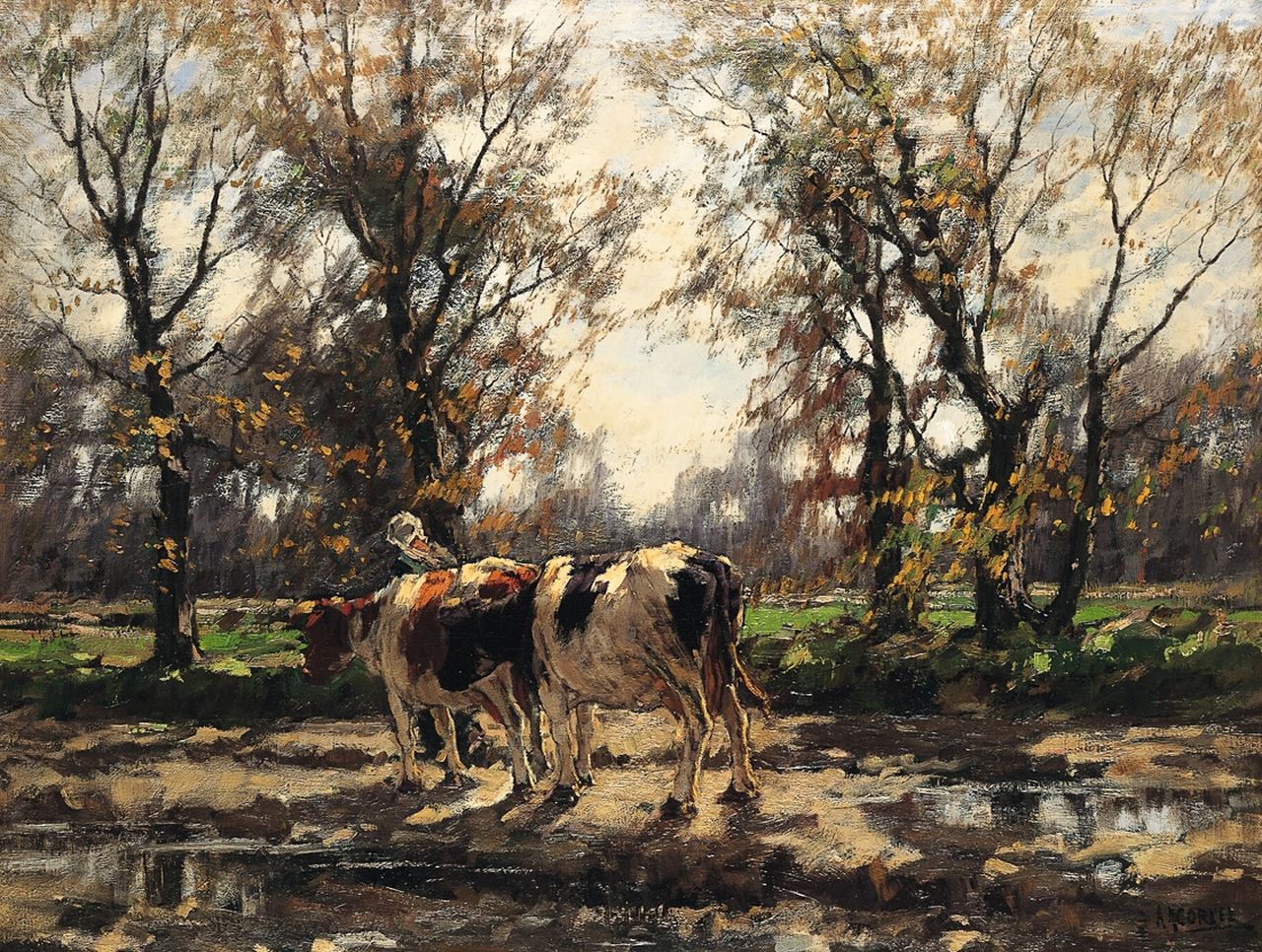 Arnold Marc Gorter Kunstwerk • Gemälde • zuvor zu verkaufen A milkmaid with her cows after an autumn shower