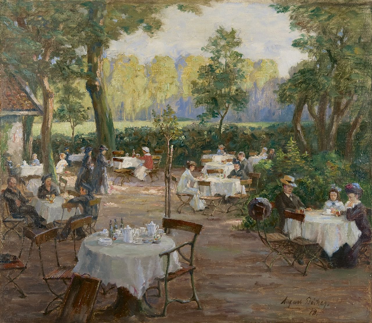 August Böcher Kunstwerk • Gemälde • zuvor zu verkaufen Afternoon in a garden café