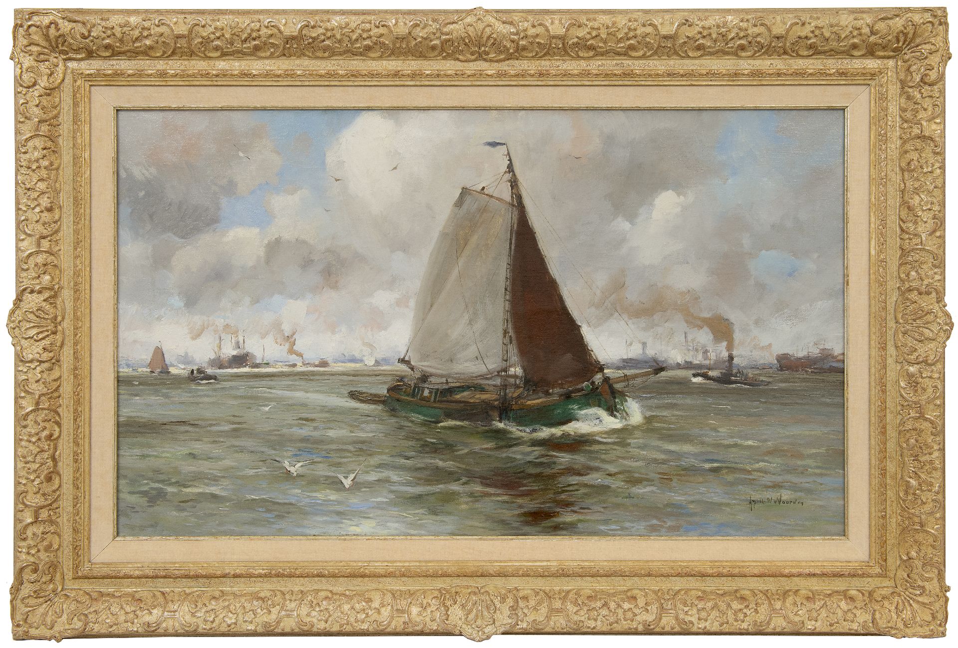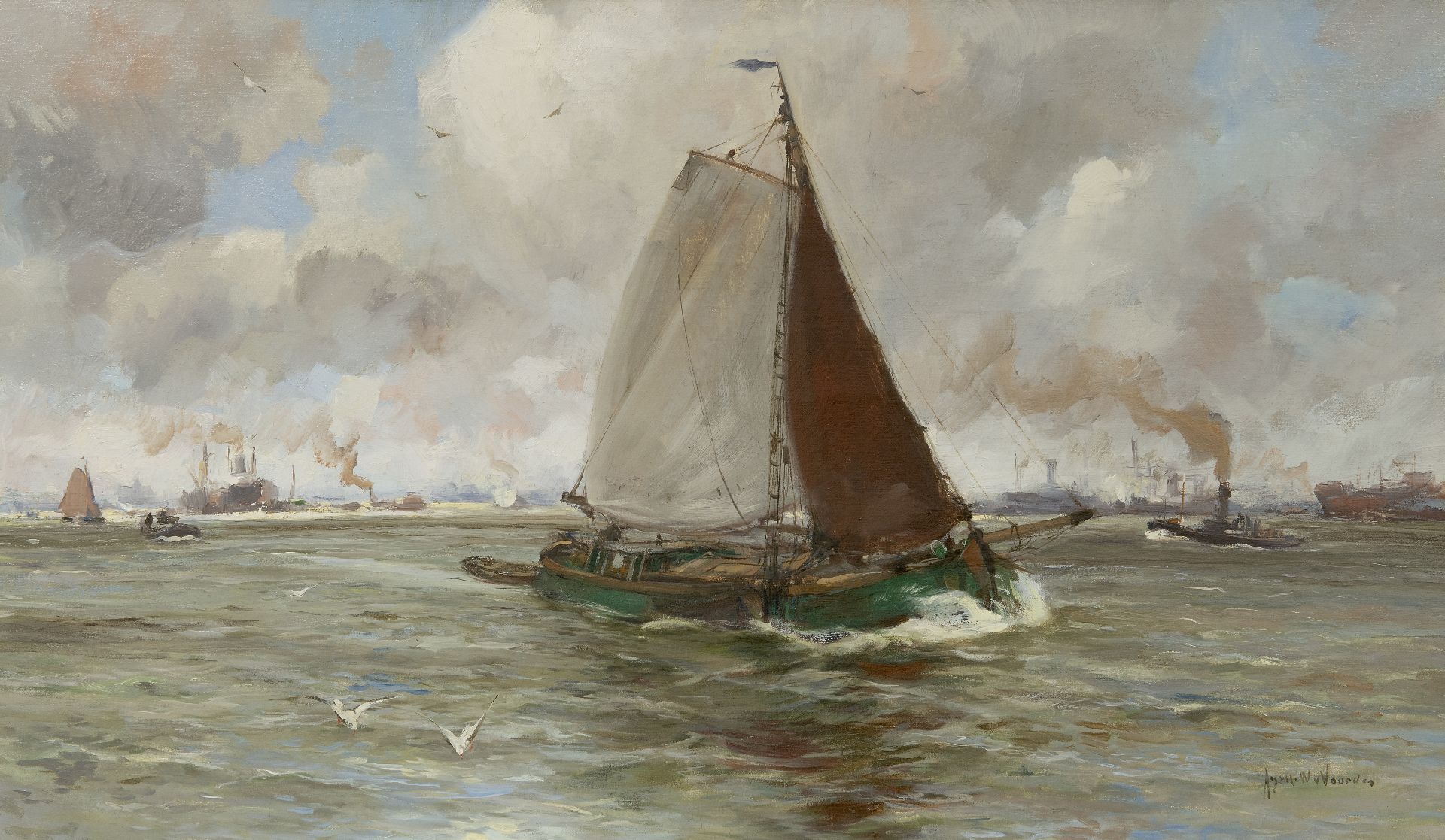 August van Voorden Kunstwerk • Gemälde • zu verkaufen Lastkahn auf dem Fluss Maasr