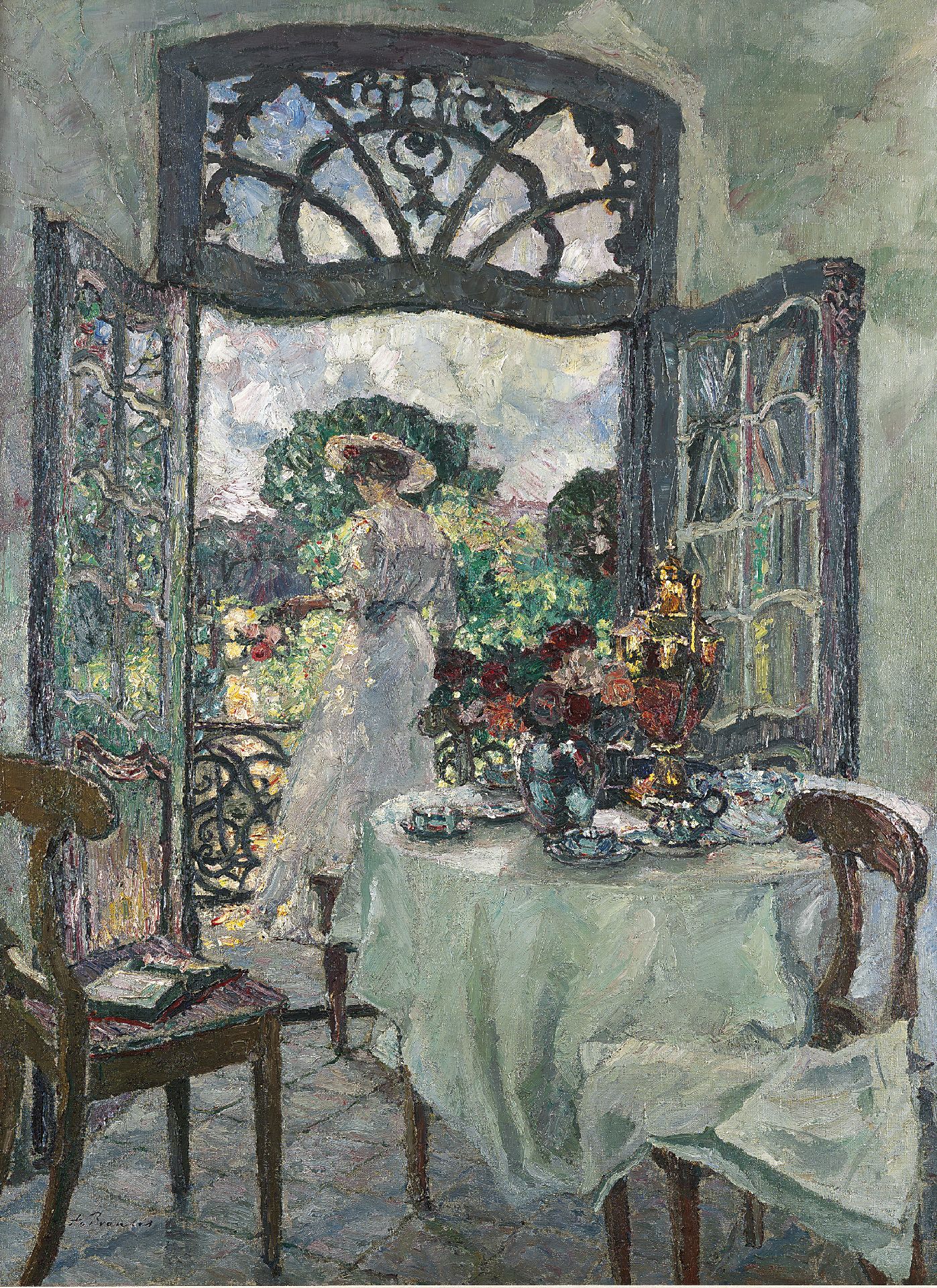 August von Brandis wurde 1862 in Haselhorst bei Spandau geboren und wurde vor allem als einflussreicher Lehrer an der Aachener Hochschule bekannt. Bis 1900 malte er hauptsächlich religiöse Szenen, danach konzentrierte er sich unter dem Einfluss der Fontainebleau-Maler auf die Darstellung von Licht und Farbe. Dann wechseln auch seine Themen und das Interieur rückt in den Vordergrund. Von Brandis malte mehrfach das Rokoko-Interieur des Hauses Uphagen in Dantzig und das Rokoko-Haus und Gartenhaus des Kaufmanns Hermann Poensgen in Kaldenkirchen.