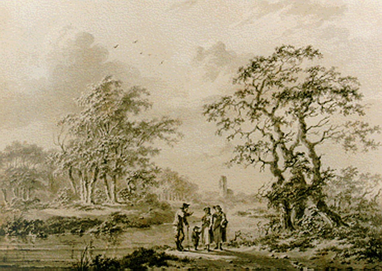 Barend Cornelis Koekkoek Kunstwerk • Aquarell • Zeichnung • zuvor zu verkaufen Extensive wooded landscape with figures on a path