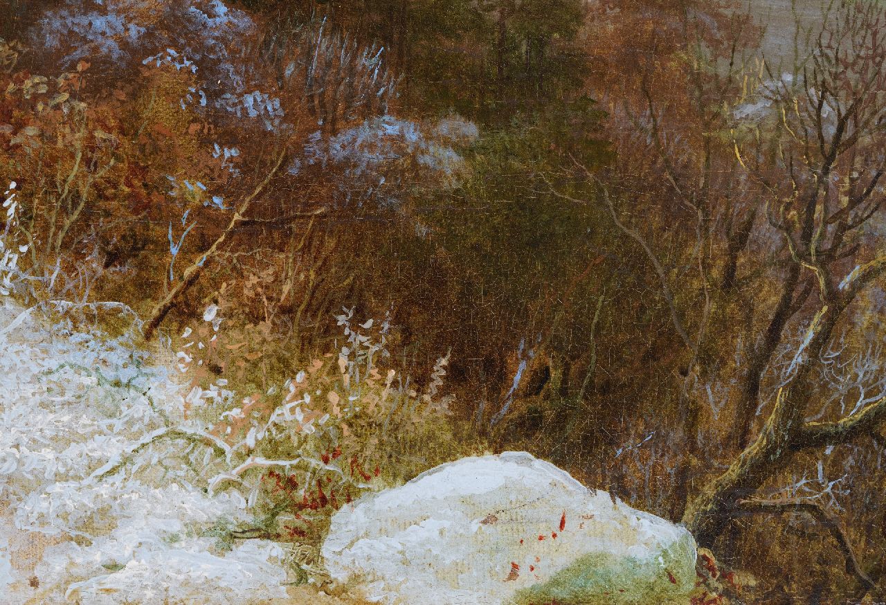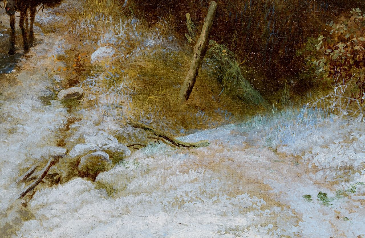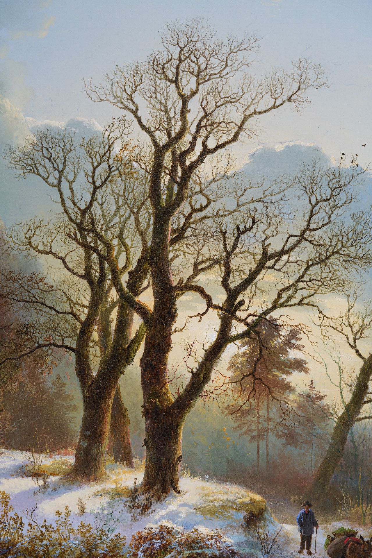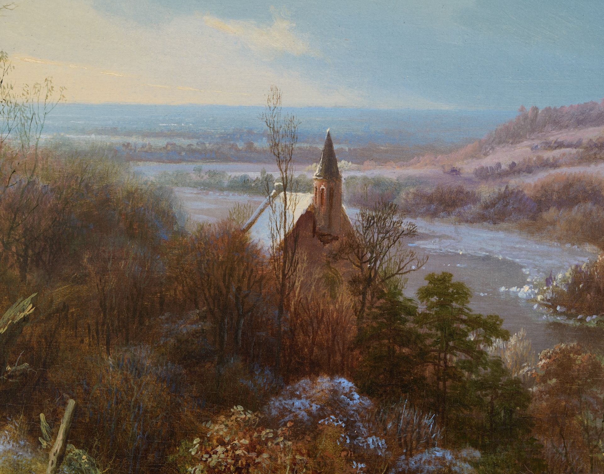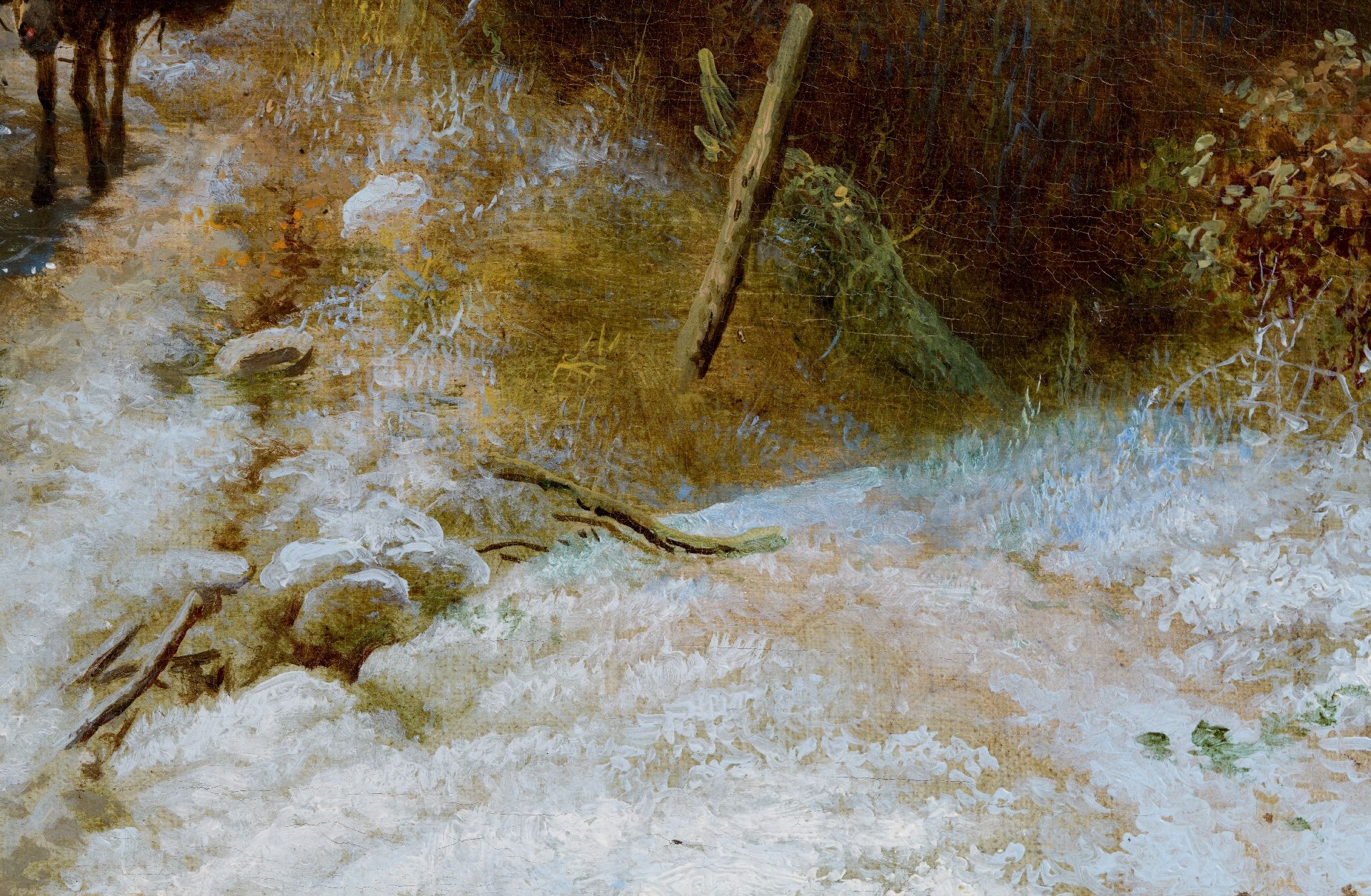 Barend Cornelis Koekkoek Kunstwerk • Gemälde • zuvor zu verkaufen Winterlandschaft mit Hirten und Rindern sowie einer Kirche im Flusstal