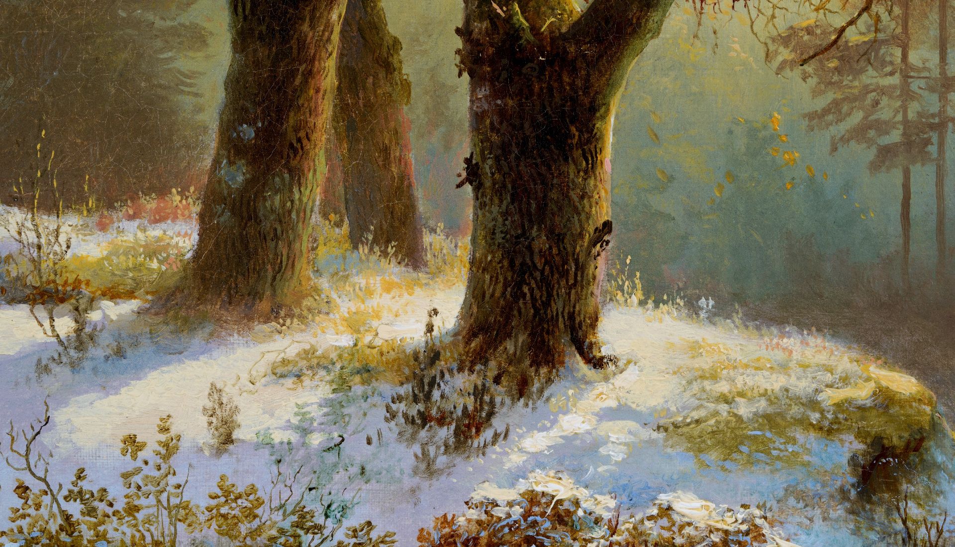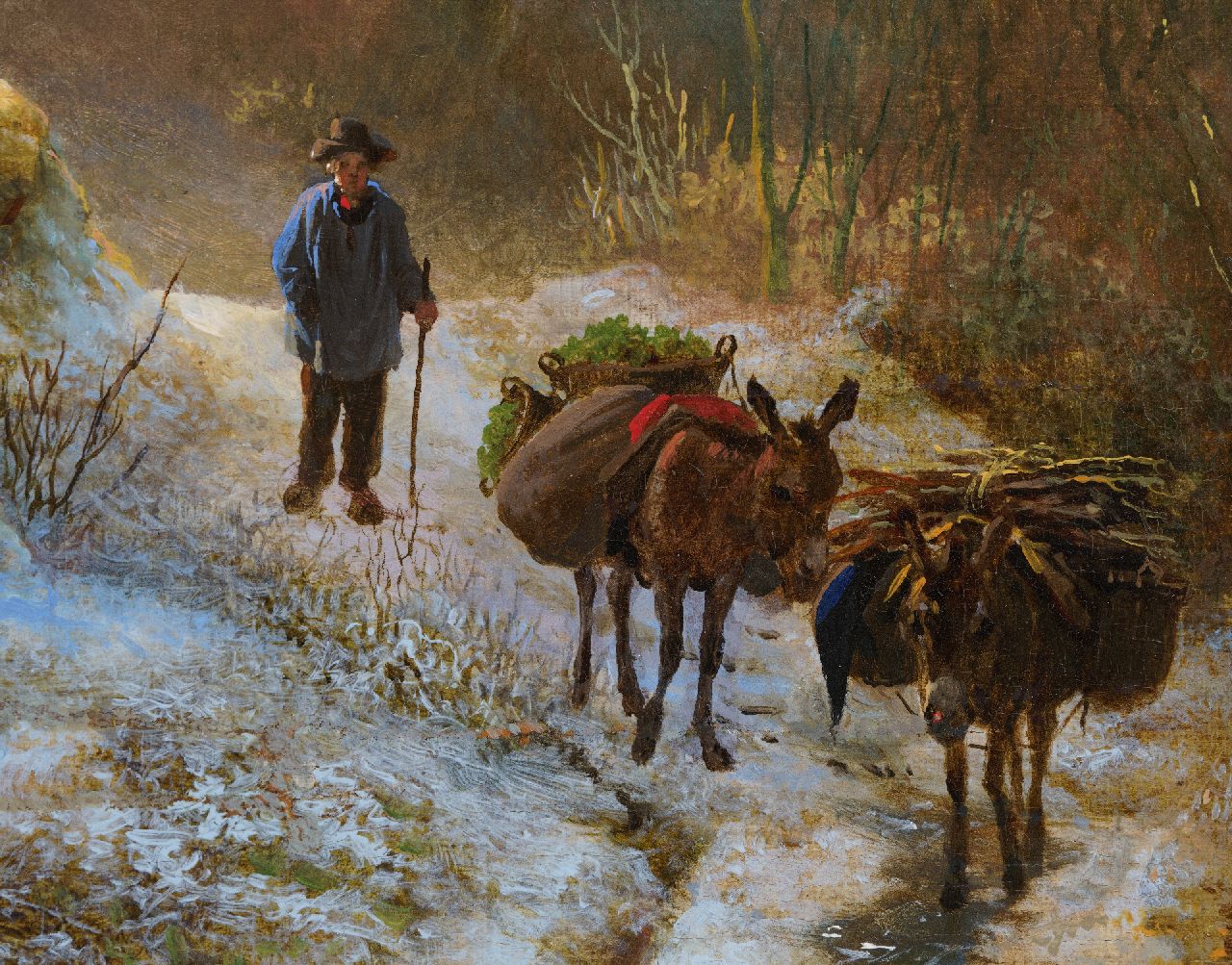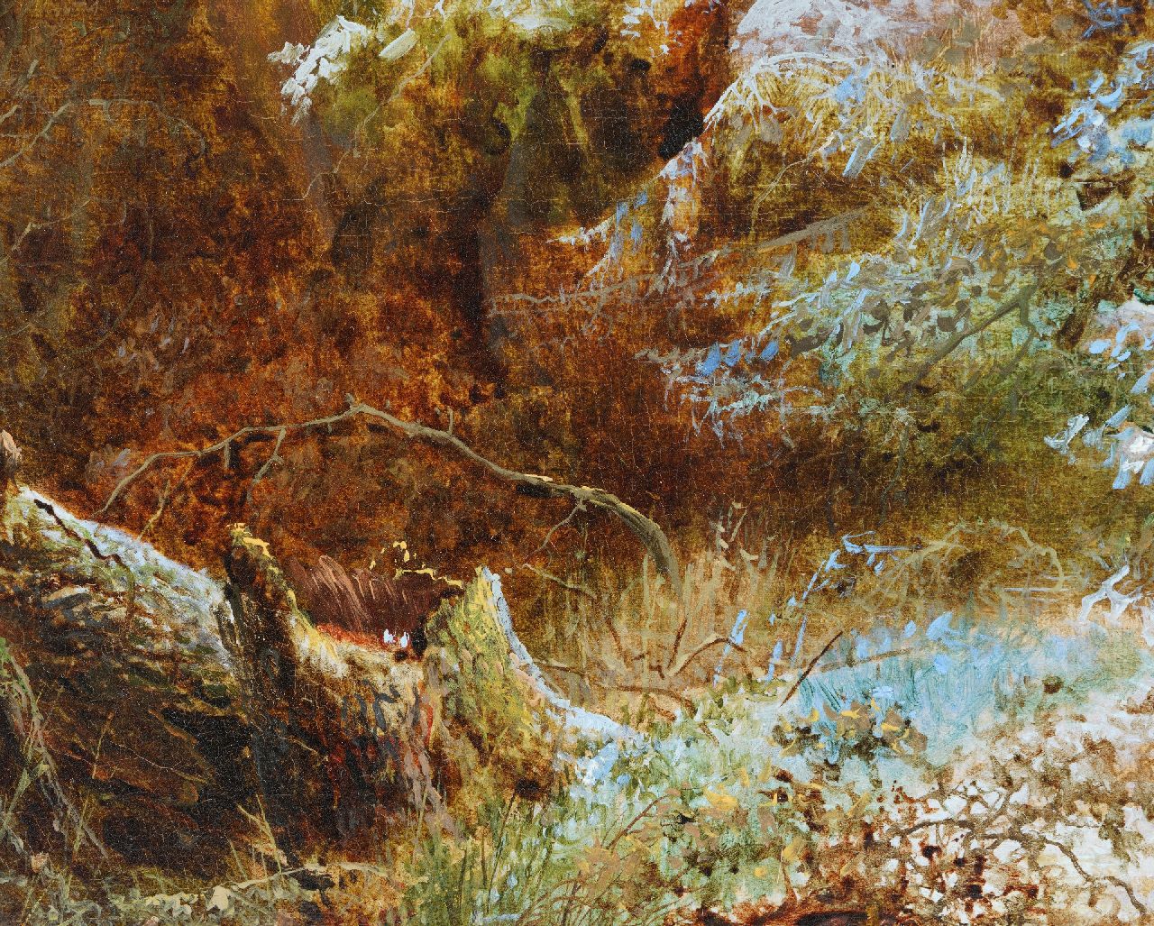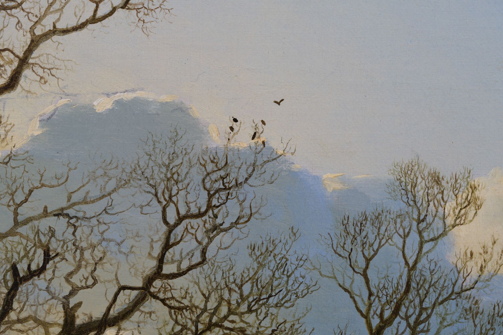 Barend Cornelis Koekkoek Kunstwerk • Gemälde • zuvor zu verkaufen Winterlandschaft mit Hirten und Rindern sowie einer Kirche im Flusstal