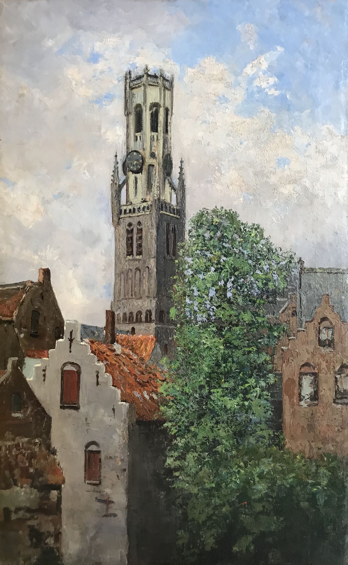 Belgische School, eerste helft 20e eeuw Kunstwerk • Gemälde • zuvor zu verkaufen Stadtansicht von Brügge mit dem Belfort