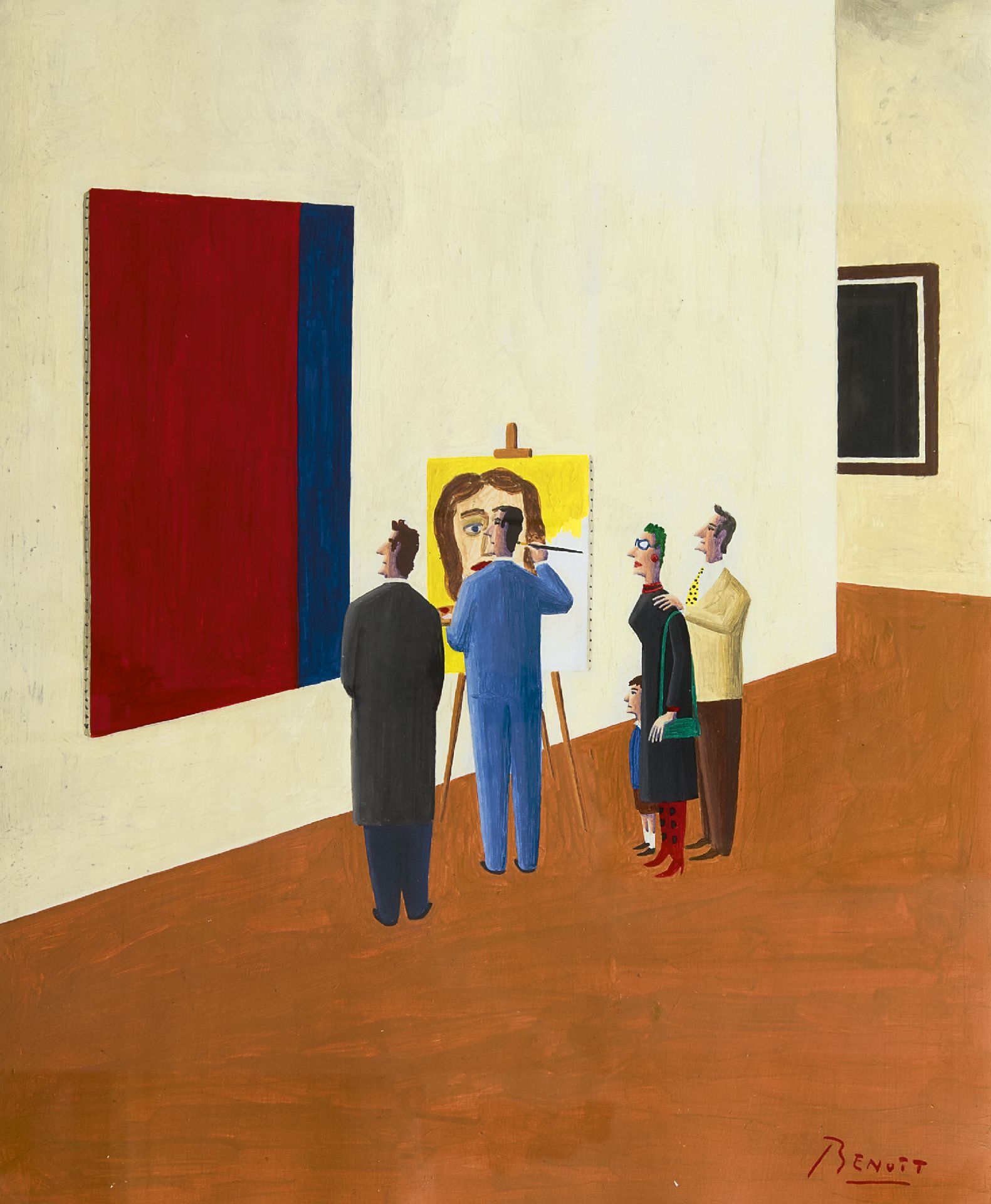Der belgische Maler Benoît van Innis ist vor allem für seine absurd-humorvollen Cartoons bekannt, die seit 1991 regelmäßig auf dem Cover von „The New Yorker“ erscheinen. Darin kommentiert er in einfachen, suggestiven Bildern das Leben der Bourgeoisie. Selten erklärt er durch Titel oder Satz; seine minutiös ausgearbeiteten Zeichnungen werden dennoch international verstanden. Künstler, Schriftsteller, Museumsbesucher sind ein beliebtes Motiv, er zeichnet auch die Ambitionen und Stimmungen 'normaler' Menschen. Bereits in den 1980er Jahren war Benoît Illustrator für eine Reihe belgischer Zeitungen und Zeitschriften. Ab 1889 gibt er Alben heraus und seine Werke werden gesammelt. Van Innis arbeitet auch als freier Künstler. Meer over deze brontekstBrontekst vereist voor aanvullende vertaalinformatie Feedback sturen Zijvensters