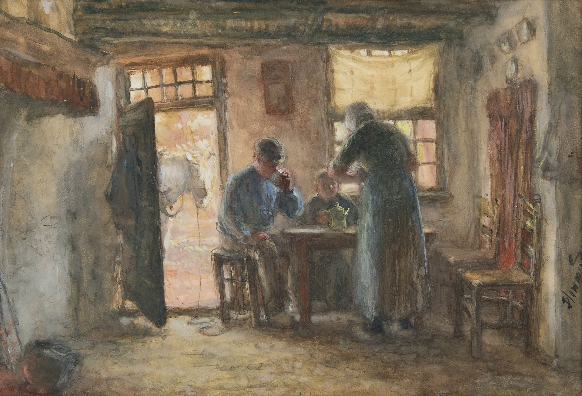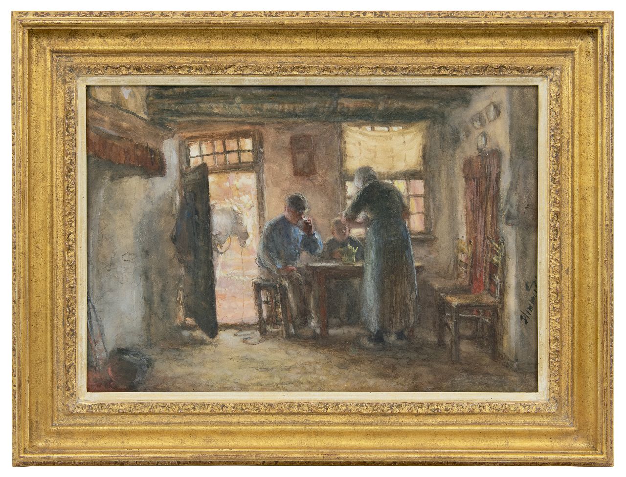 Bernard Blommers Kunstwerk • Aquarell • Zeichnung • zu verkaufen Bauernfamilie um den Tisch