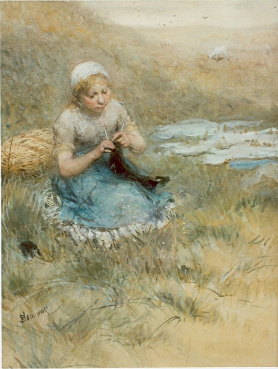 Bernard Blommers Kunstwerk • Aquarell • Zeichnung • zuvor zu verkaufen Girl knitting in the dunes