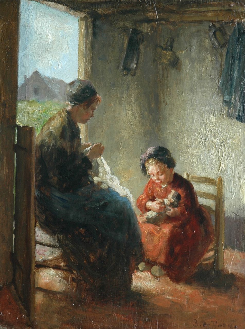 Bernard de Hoog ist namentlich bekannt geworden als Maler von stimmungsvollen holländischen Bauerninterieuren, einem Genre das vor allem nach 1880 in unserem Land sehr beliebt wurde. Er lebte und arbeitete in Amsterdam bis er 1899 nach Laren umzog, wo er mit den Werken von Malern wie Albert Neuhuys, Hendrik Kever en Evert Pieters Bekanntschaft machte. In seinen Interieuren benachdruckte er meistens die Figuren, gewöhnlich Mütter und Kinder, die im ruhigen Rhythmus ihrer tagtäglichen Beschäftigungen das Muster bilden von einem erhabenen, häuslichen Glück. Nach dem Jahr 1924, als er im Haag wohnte, malte De Hoog auch das Fischerleben und dann und wann eine Landschaft mit Vieh. Viele seiner Werke wurde gekauft von Sammlern aus Amerika, Canada und England.