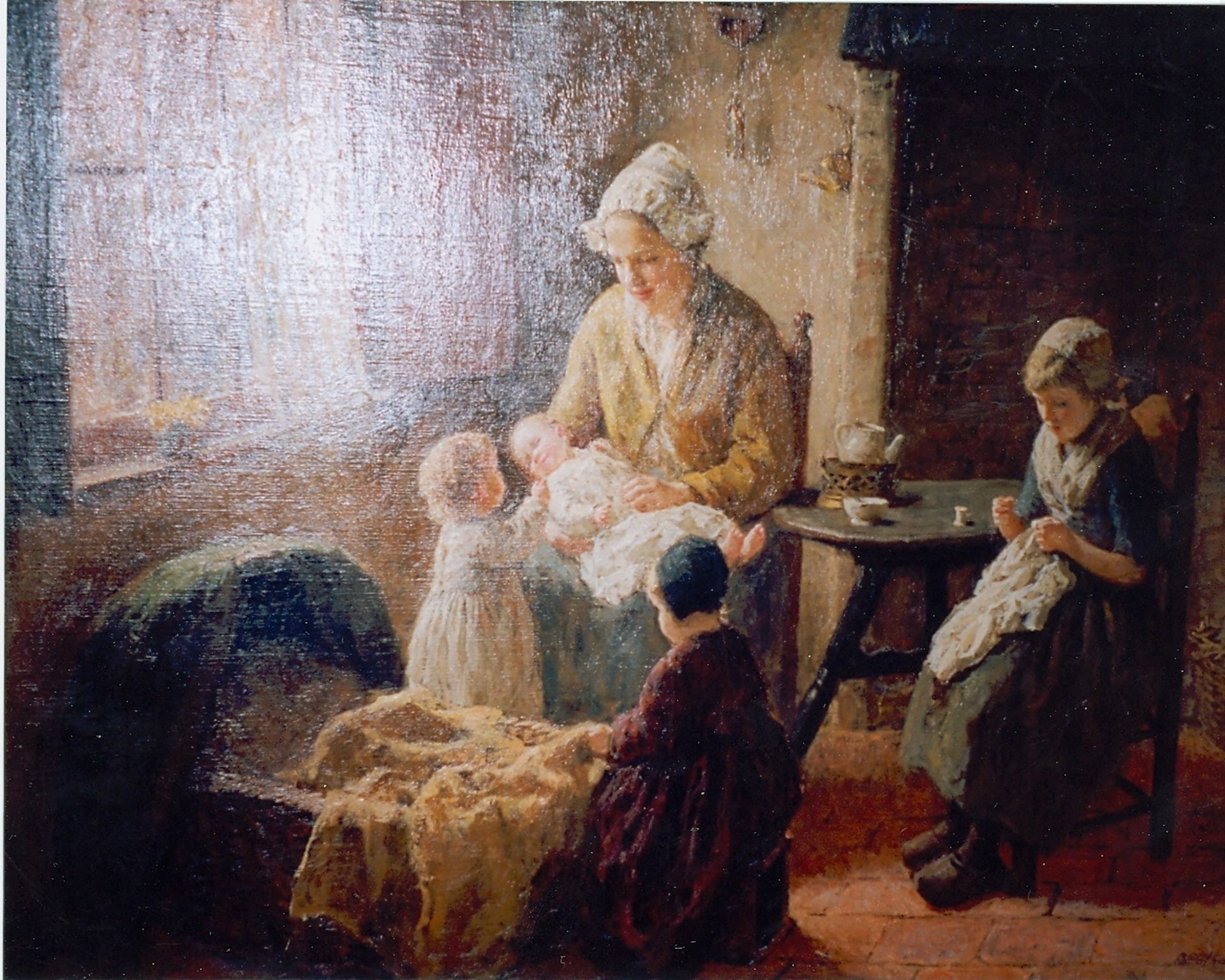 Der belgische Maler Bernard Pothast wohnte und arbeitete zunächst in Amsterdam und ließ sich dann 1911 in Laren nieder. Dort schloß er sich der Larense School an, wo Maler wie Hendrik Kever und Albert Neuhuys schon mal zu gehörten. Er malte da das Leben der schlichten Bauernleute innerhalb und außerhalb des Bauernhofes und auf dem Felde. Namentlich seine Innnenräume mit Bäuerinnen und Kindern strahlen eine abgeklärte Ruhe aus.