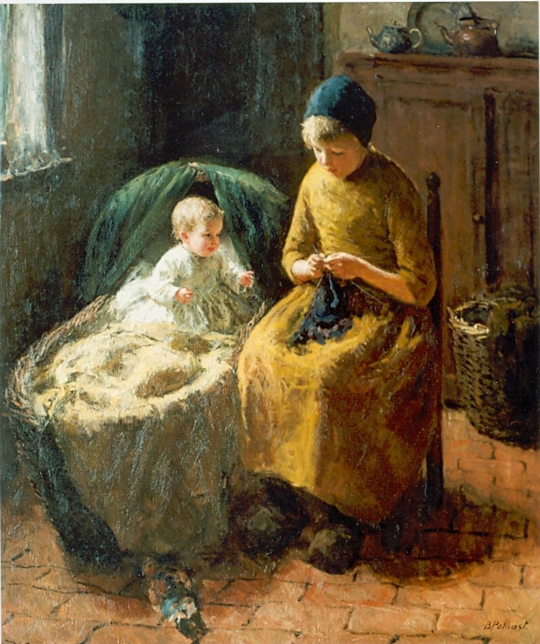 Der belgische Maler Bernard Pothast wohnte und arbeitete zunächst in Amsterdam und ließ sich dann 1911 in Laren nieder. Dort schloß er sich der Larense School an, wo Maler wie Hendrik Kever und Albert Neuhuys schon mal zu gehörten. Er malte da das Leben der schlichten Bauernleute innerhalb und außerhalb des Bauernhofes und auf dem Felde. Namentlich seine Innnenräume mit Bäuerinnen und Kindern strahlen eine abgeklärte Ruhe aus.