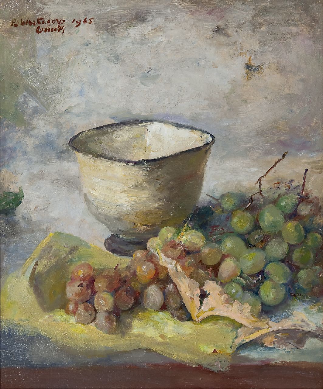 Westendorp-Osieck J.E.  | Johanna Elisabeth 'Betsy' Westendorp-Osieck, A still life with grapes and a bowl, Öl auf Malereifaser 45,9 x 37,9 cm, signed u.l. und dated 1965