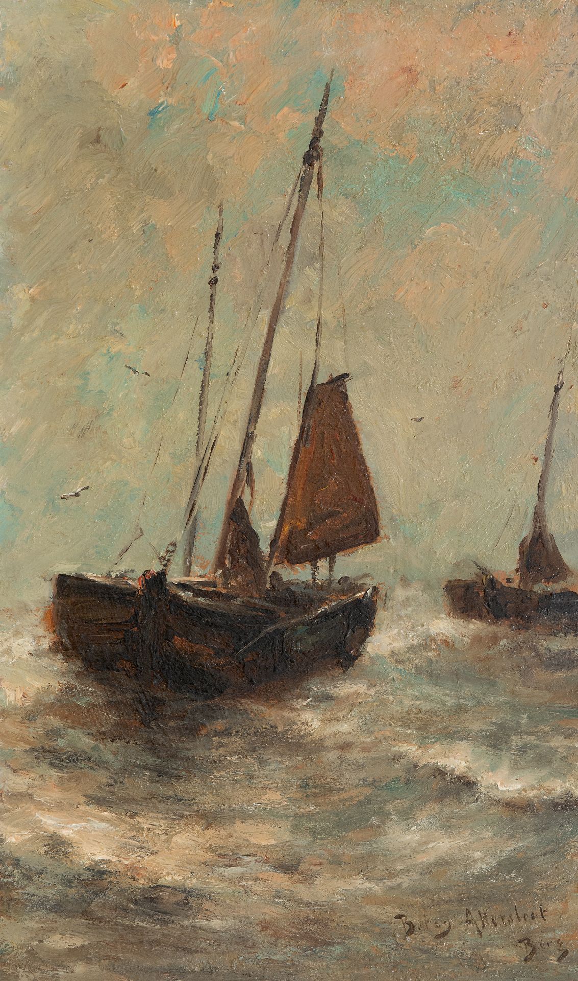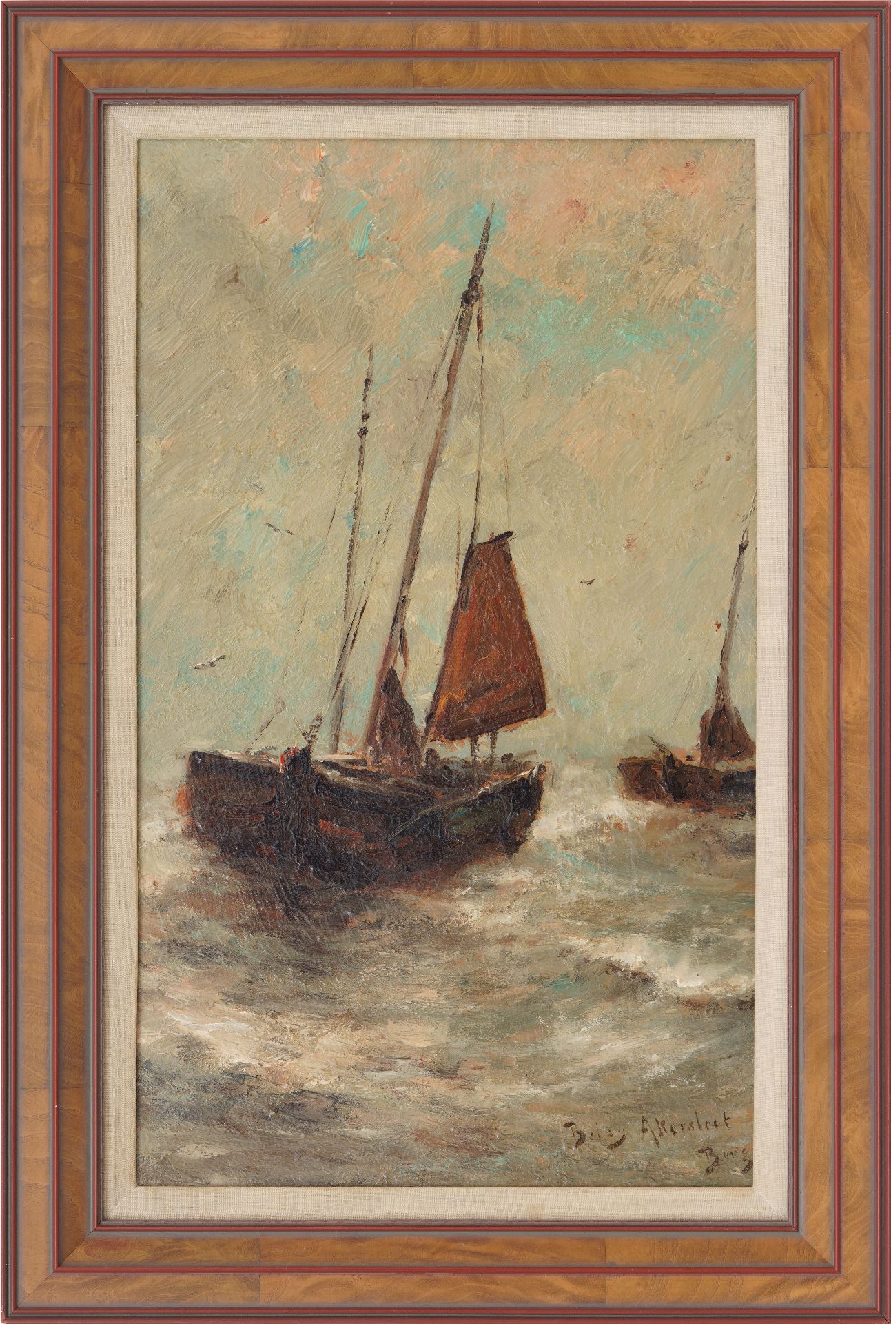 Betzy Rezora Berg Kunstwerk • Gemälde • zuvor zu verkaufen 'Bomschiffe' in der Brandung, Scheveningen