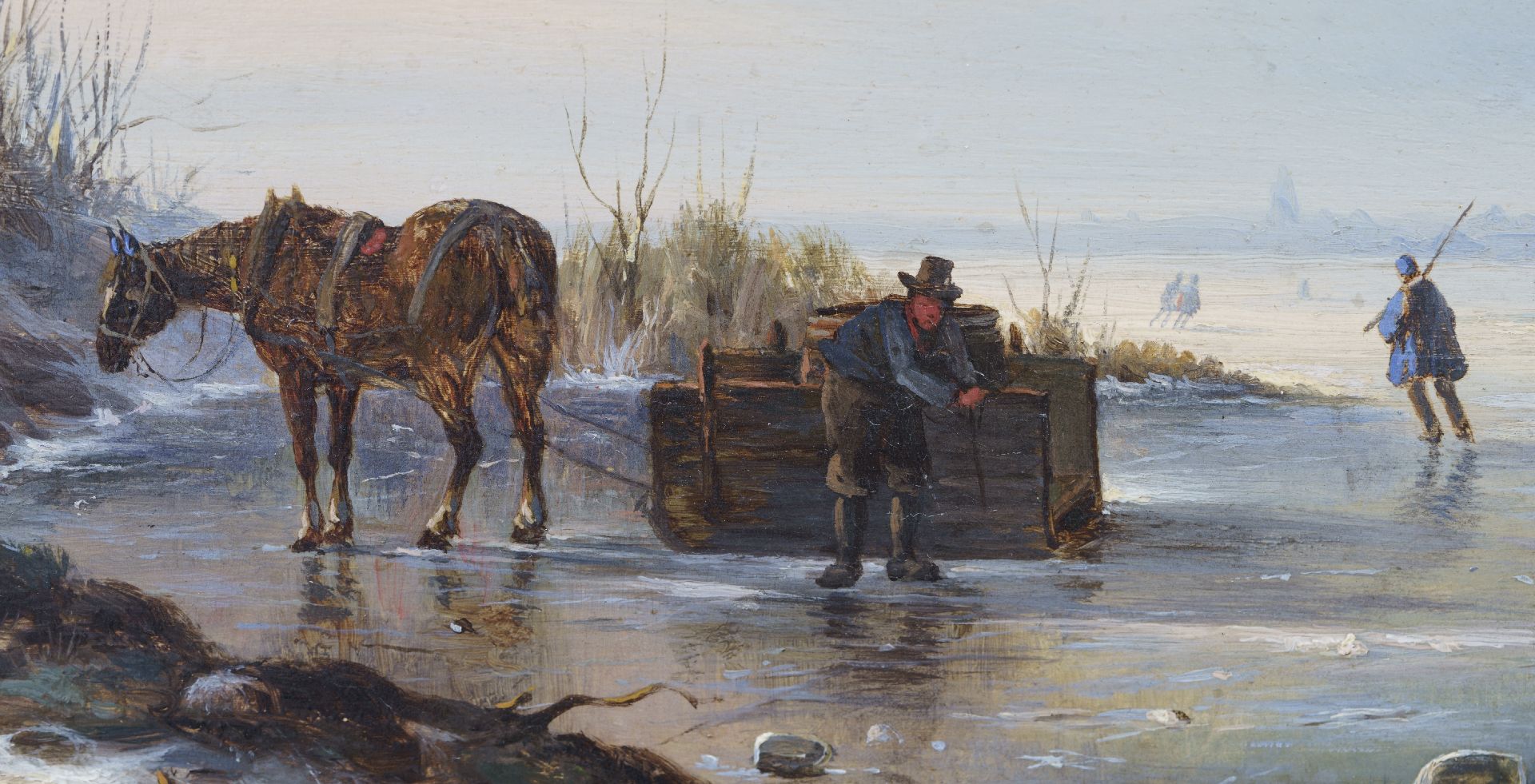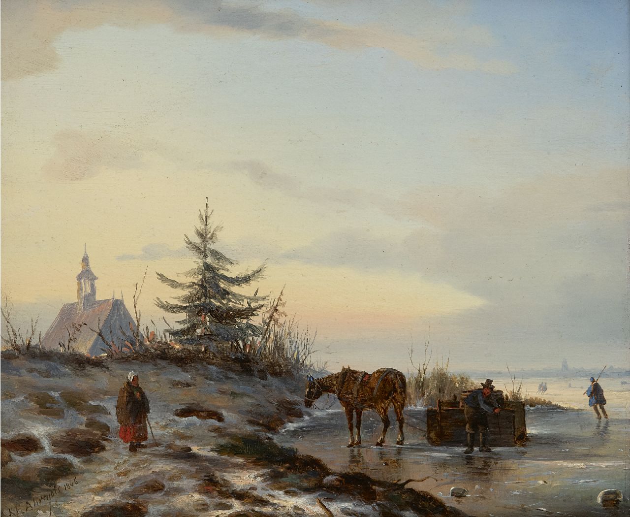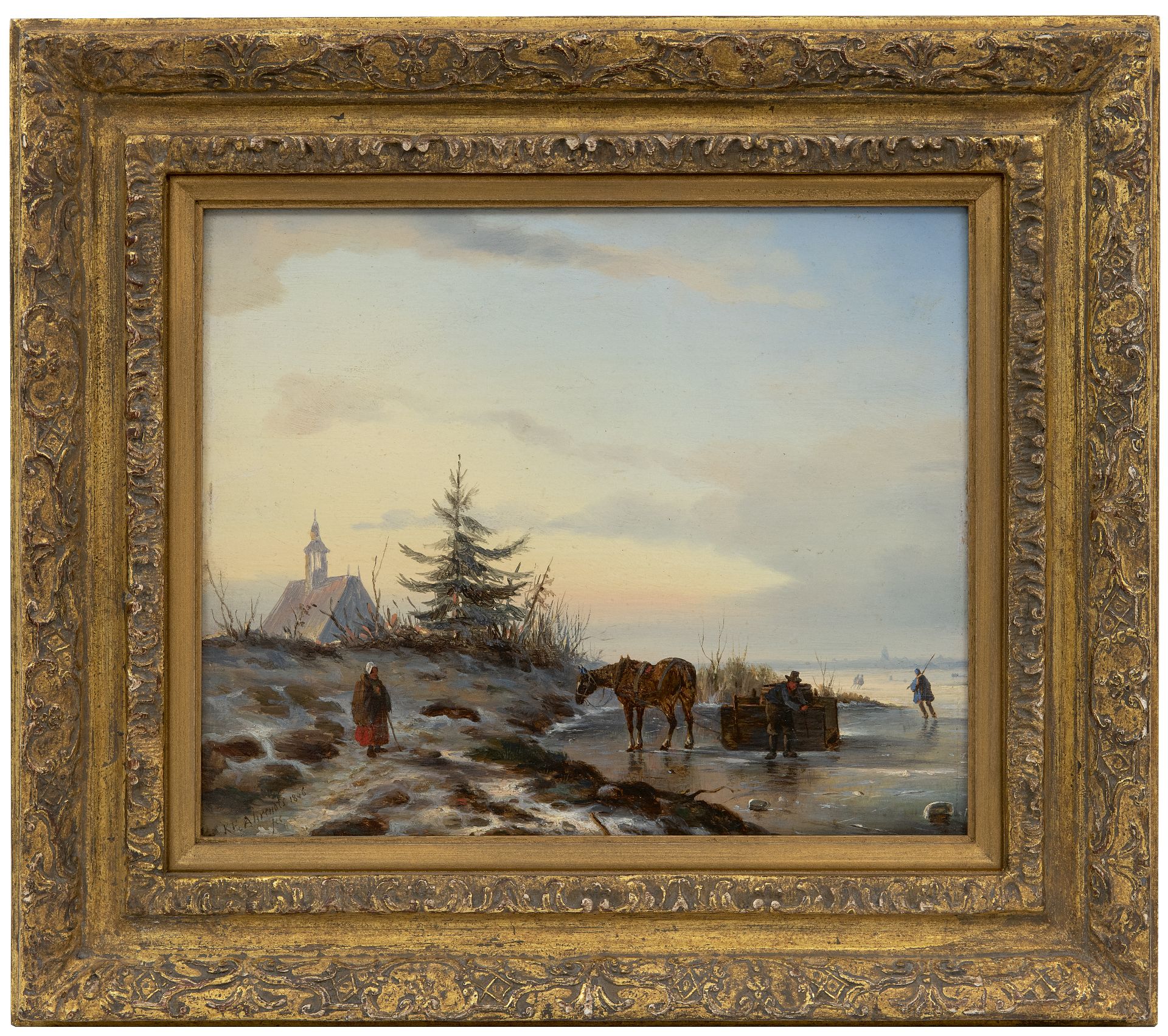 Carl Eduard Ahrendts Kunstwerk • Gemälde • zuvor zu verkaufen Pferd und Schlitten auf gefrorenem Fluss