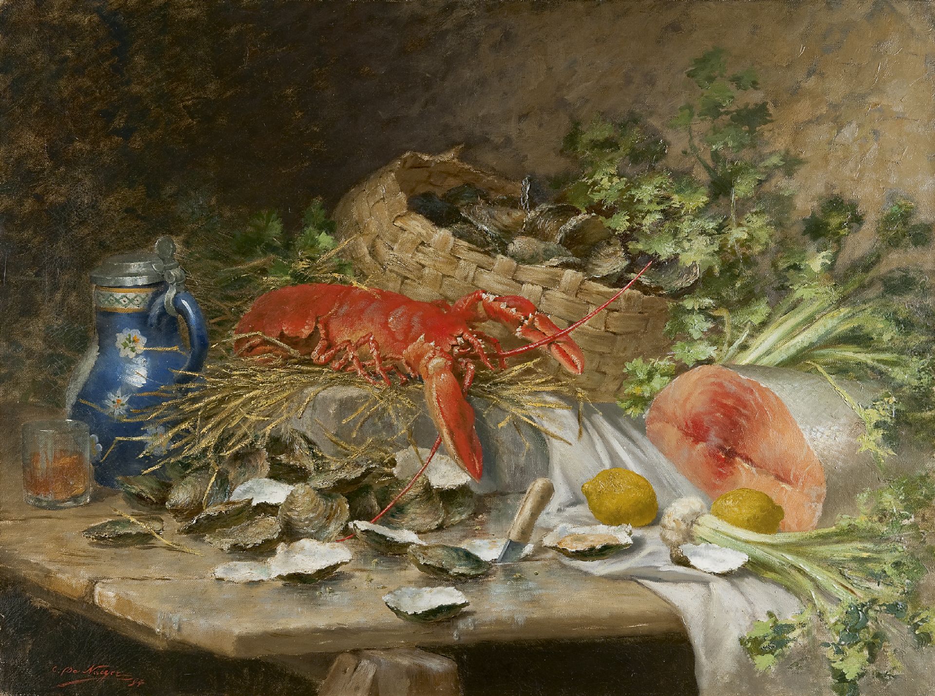 Charles de Naeyer Kunstwerk • Gemälde • zuvor zu verkaufen A still life of a lobster, a salmon and oysters