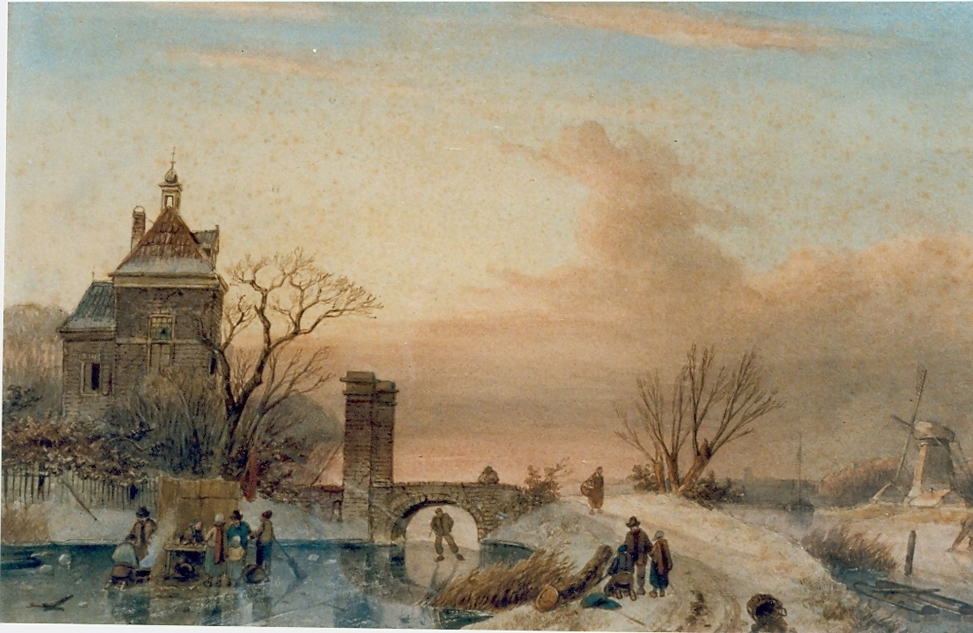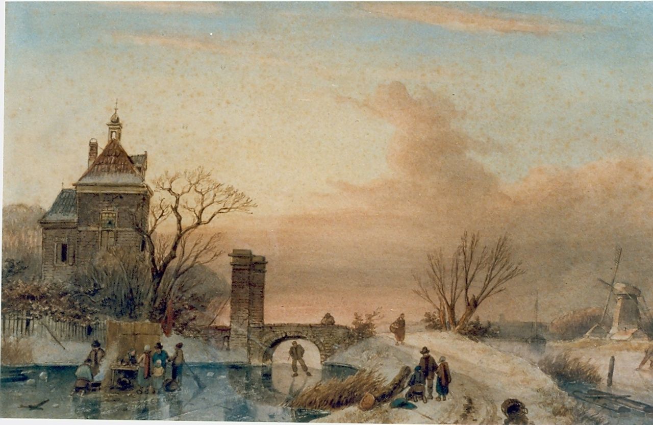 Charles Leickert Kunstwerk • Aquarell • Zeichnung • zuvor zu verkaufen Evening twilight, figures skating on the ice