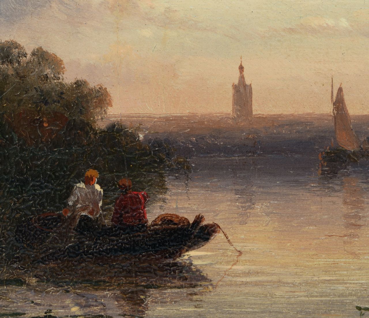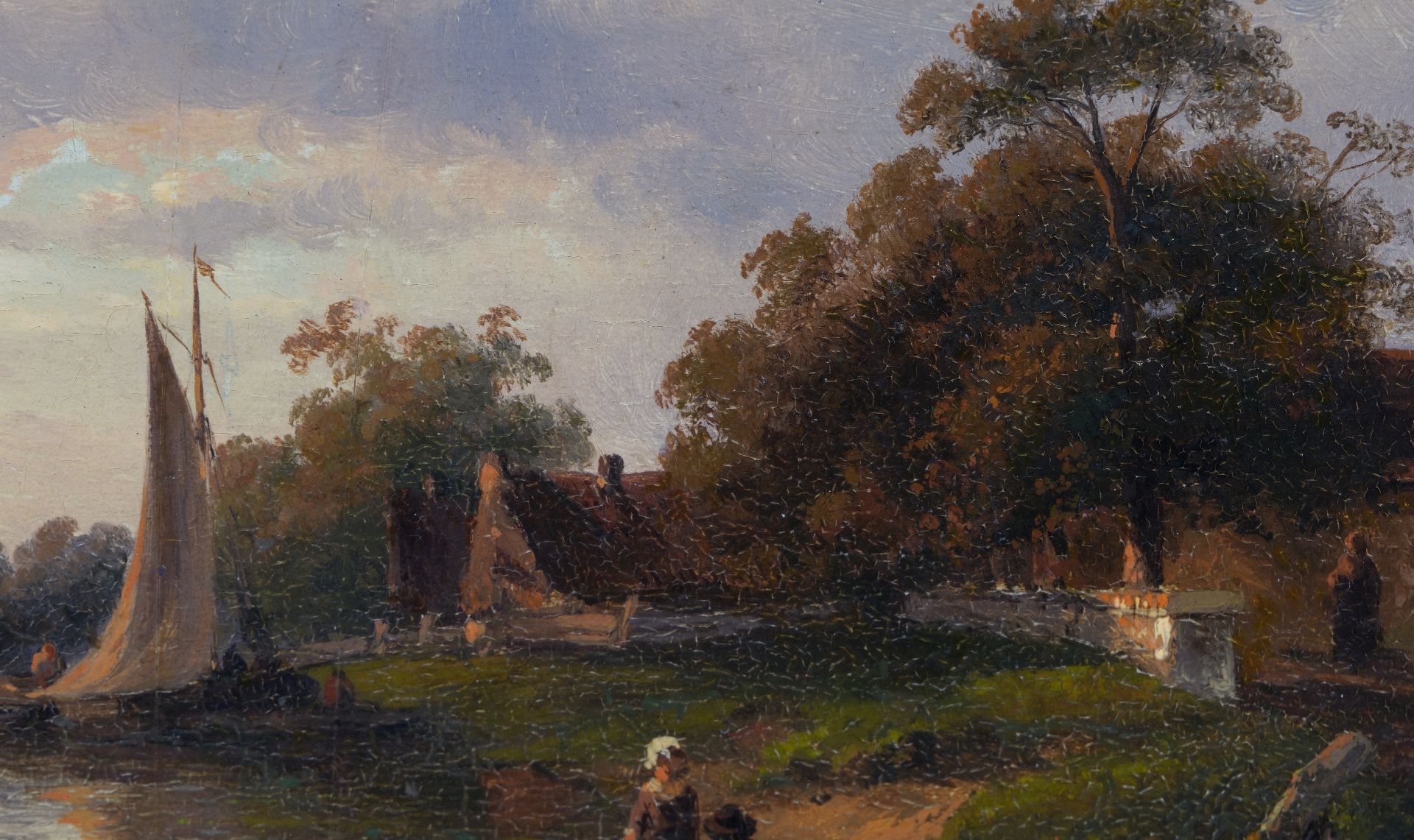 Die Anziehungskraft der Gemälde von Charles Leickert wird vor allem durch die leichten und stark erzählerischen Details bestimmt. Er war ein echter Handwerker, der geschickt die richtige Stimmung darstellen konnte und so den Geschmack des Publikums erspürte. Seine Wintergesichter sind wirklich kalt, seine Sommer sonnig und grün. Leickert beginnt seine Ausbildung an der Haagsche Teekenacademie und arbeitet gleichzeitig im Atelier von Bart van Hove, Maler von Stadtbildern und Bühnenbildern. Nach Abschluss der Teeken Academy setzt Leickert seine Studien im Atelier von Wijnand Nuijen fort. Nach seinem Tod – er war erst 26 Jahre alt – setzte Leickert sein Atelierstudium bei Andreas Schelfhout fort, wo er sich zunehmend der Landschaftsmalerei, insbesondere der Wintermalerei, widmete. 1850 ging Leickert nach Amsterdam und fortan wurden seine Motive immer vielfältiger. Während die Türme von Dordrecht, Woudrichem und Schiebroek unter dem Einfluss von Nuijen ein häufiges Motiv in seinen früheren Arbeiten waren, malt er heute oft am Wasser, am Strand und an Flüssen – an Orten mit viel Aktivität. Es gibt viel Platz für die Darstellung der Schönheit der Natur; ein geschichteter Himmel, der einen nahenden Schneesturm anzukündigen scheint, und einen blaugrau zugefrorenen Fluss mit einem wunderschönen Licht auf halber Höhe des Horizonts. Leickerts „Heimweh“-Gemälde boten Menschen Orientierung, die mit der sich schnell verändernden Gesellschaft Schwierigkeiten hatten. Zeitgenössische Motive wie Züge und Dampfschiffe, wie sie Schelfhout verwendet, kommen in seinen Gemälden nicht vor. Er zog es vor, eine zeitlose Landschaft einzufangen, die die Schönheit der Natur widerspiegelt.
