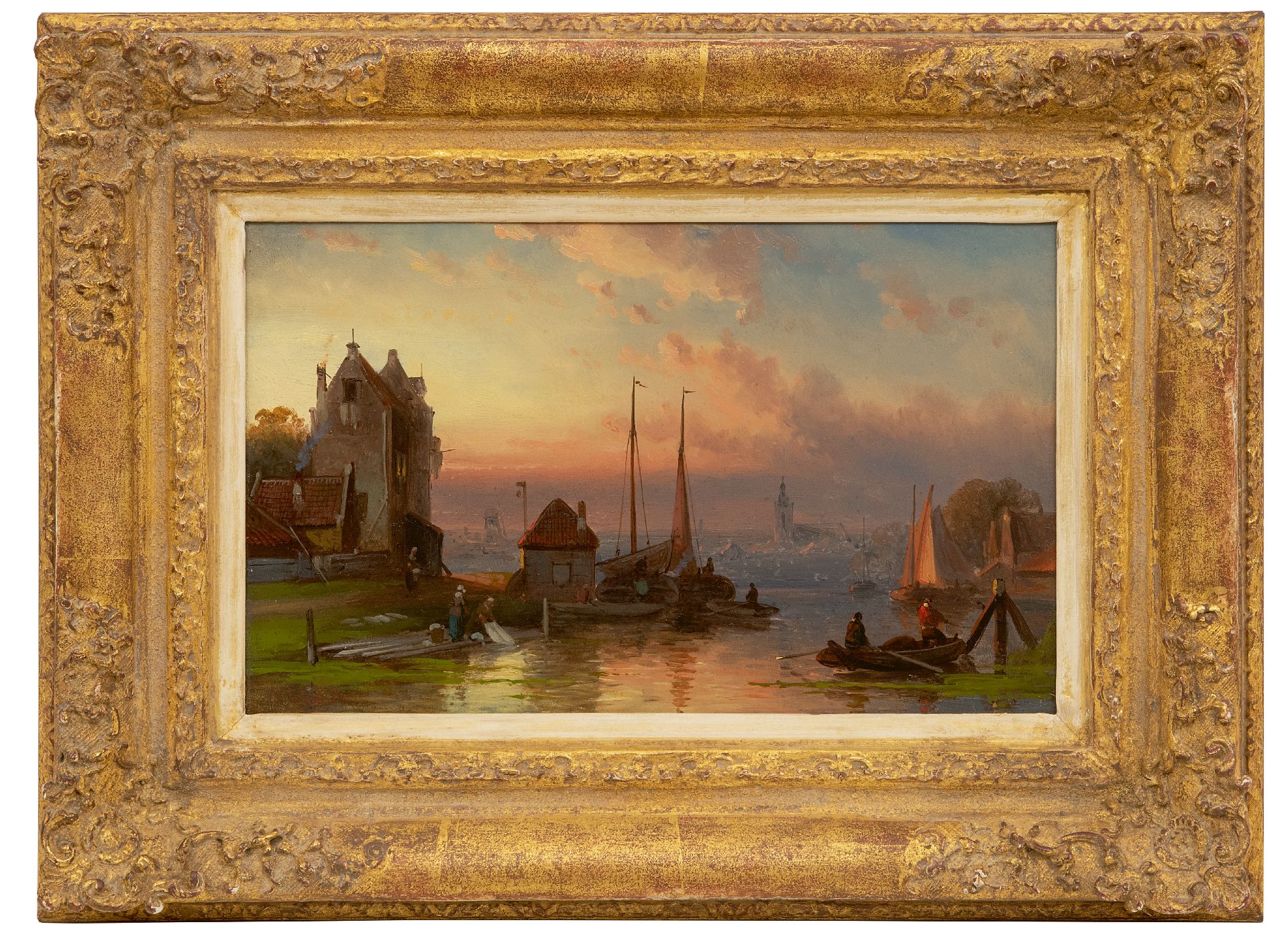 Charles Leickert Kunstwerk • Gemälde • zu verkaufen Schiffe auf einem Fluss bei Sonnenuntergang