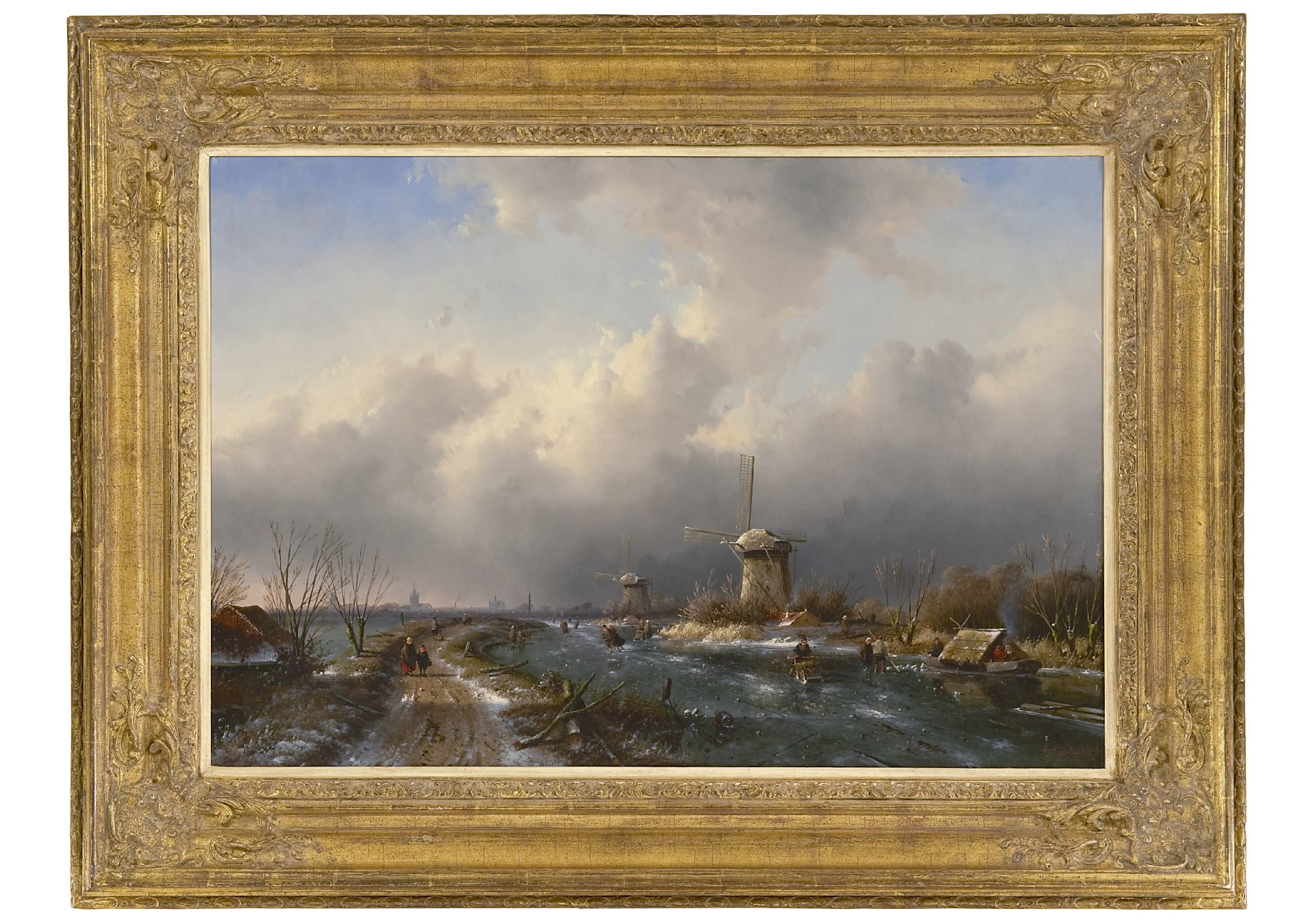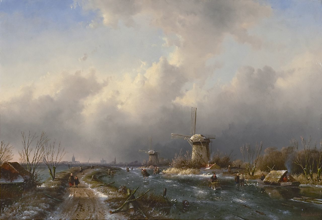 Charles Leickert Kunstwerk • Gemälde • zuvor zu verkaufen Schlittschuhläufer auf dem Eis mit Mühlen und einer Stadt am Horizont