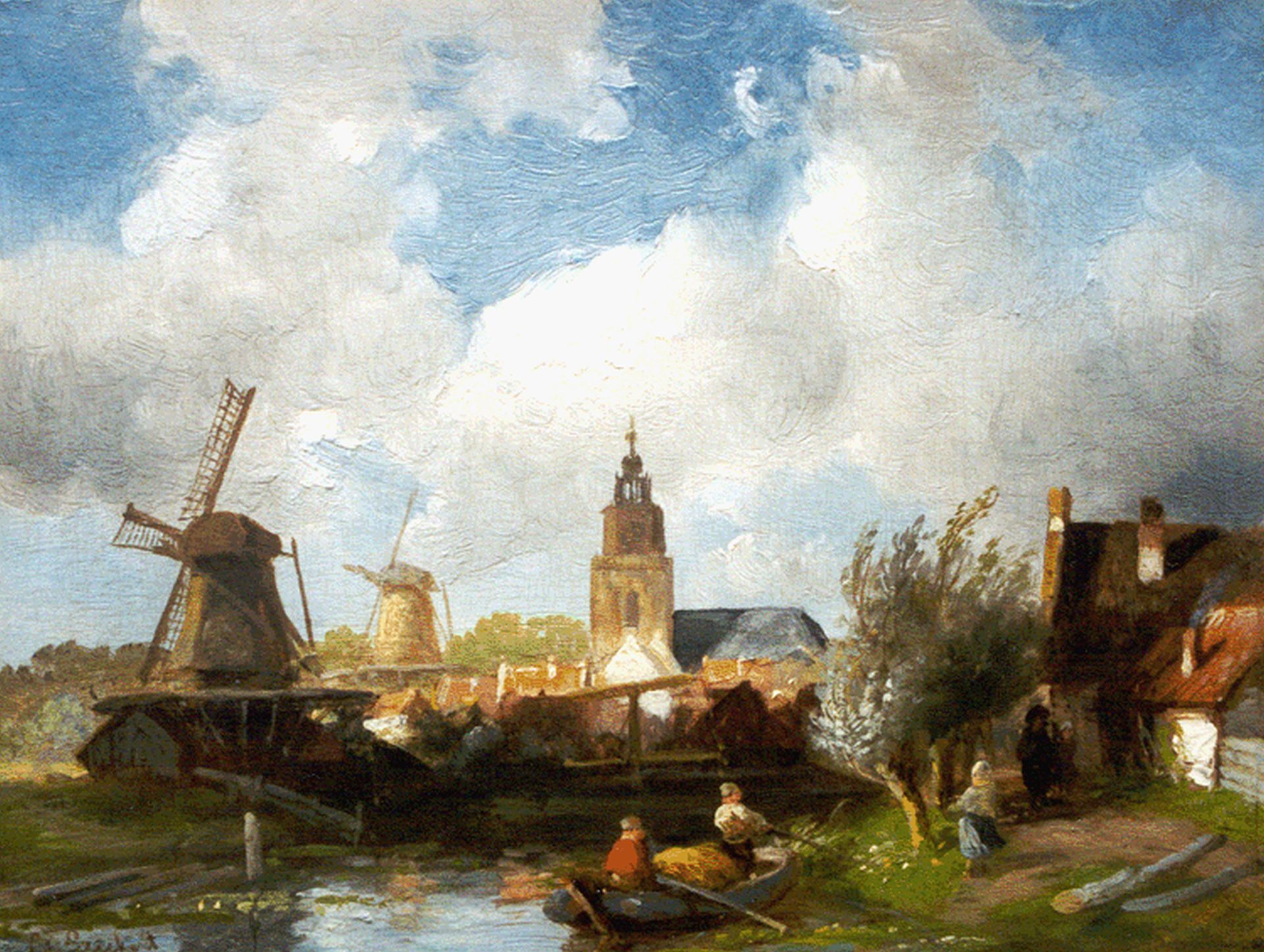 Charles Leickert Kunstwerk • Gemälde • zuvor zu verkaufen A river landscape, with a village beyond