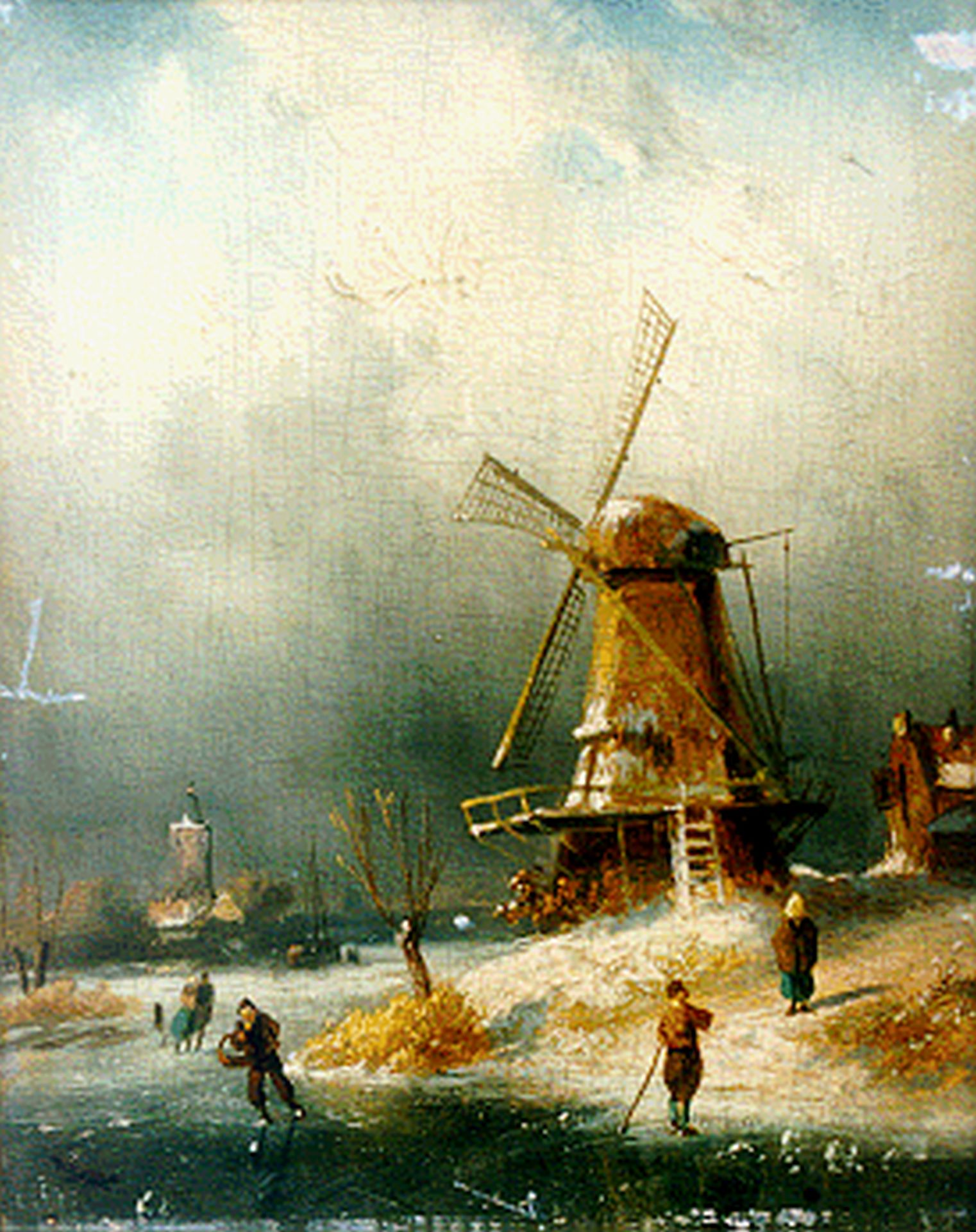 Charles Leickert Kunstwerk • Gemälde • zuvor zu verkaufen Skaters on the ice by a windmill
