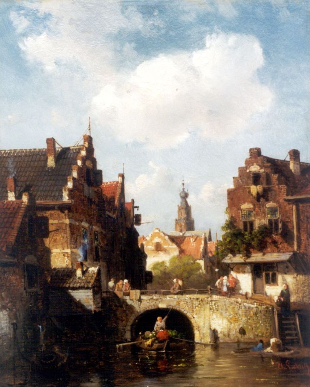 Charles Leickert Kunstwerk • Gemälde • zuvor zu verkaufen View of a canal, with a church beyond