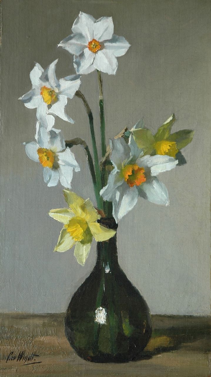 Chris van der Windt Kunstwerk • Gemälde • zuvor zu verkaufen Yellow and white daffodils in a vase