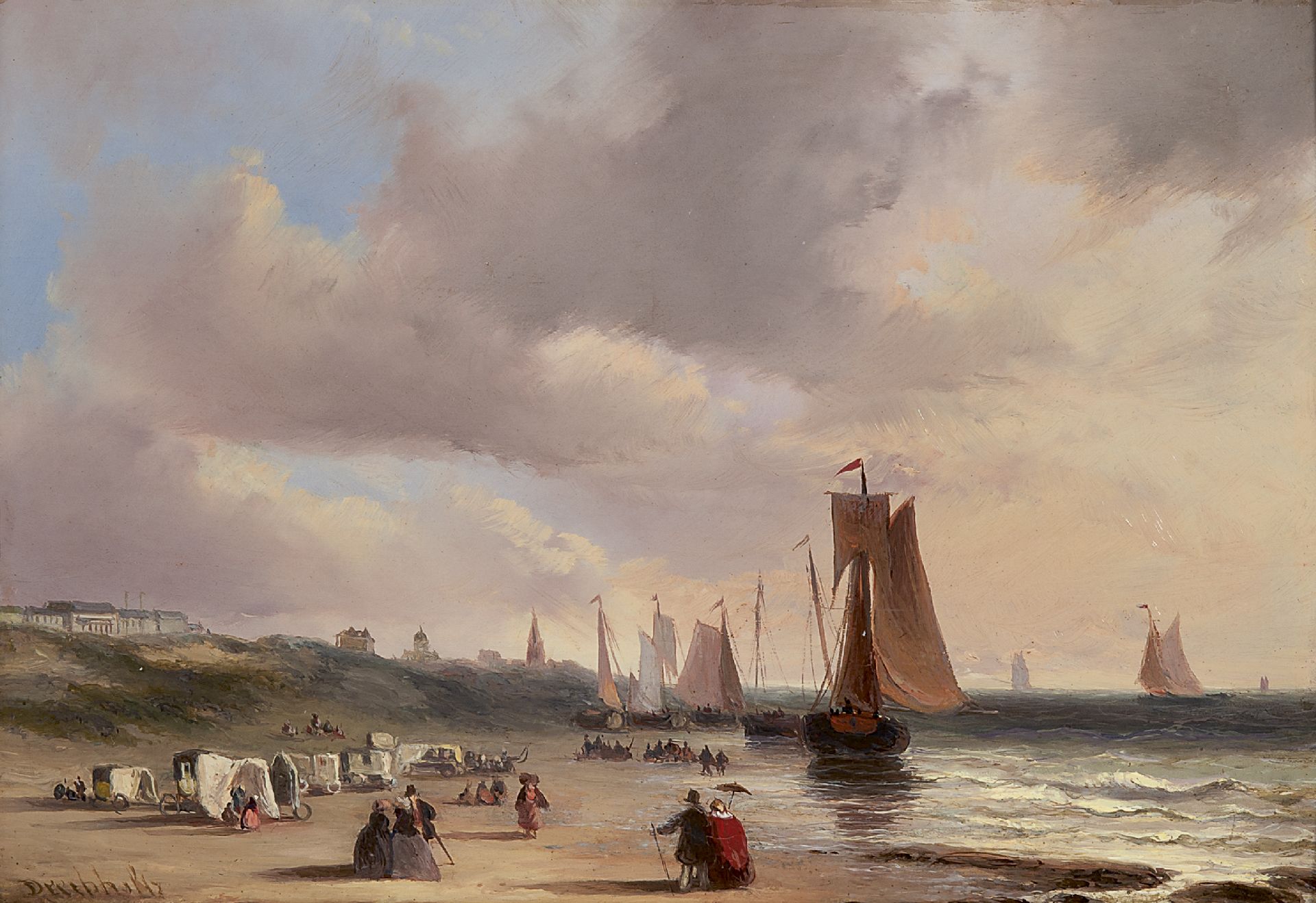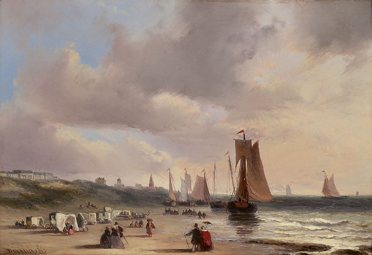 Christiaan Lodewijk Willem Dreibholtz Kunstwerk • Gemälde • zuvor zu verkaufen 'Bomkähne', Badekutschen und Spaziergänger auf dem Strand von Scheveningen