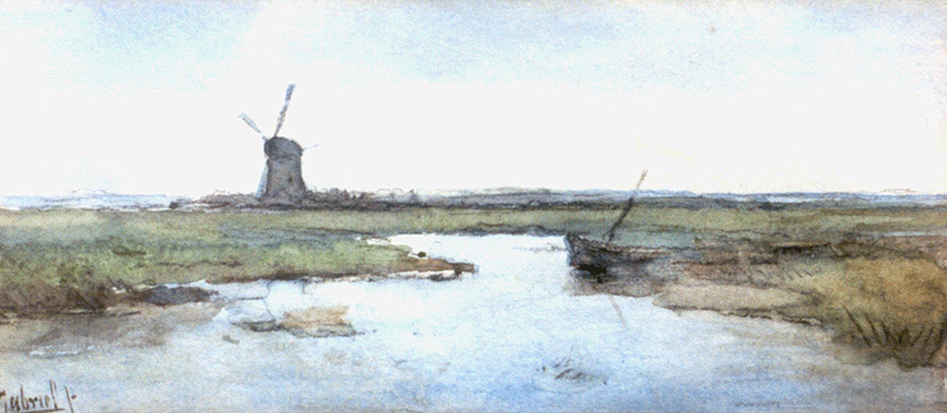 Constan Gabriel Kunstwerk • Aquarell • Zeichnung • zuvor zu verkaufen A polder landscape with windmill