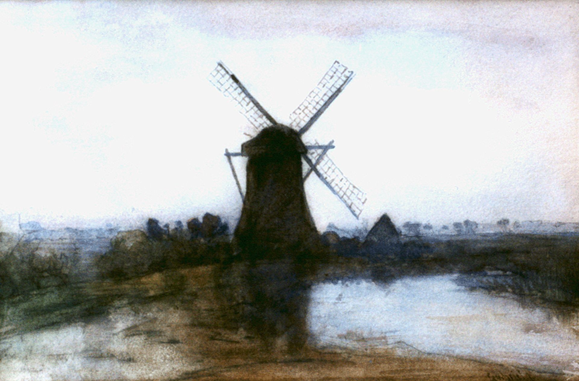 Constan Gabriel Kunstwerk • Aquarell • Zeichnung • zuvor zu verkaufen A windmill in a landscape