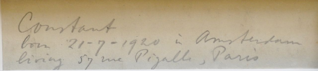 Constant begegnete 1948 Karel Appel und Corneille; mit ihnen und mit Dotremont, Noirot und Asger Jorn gründete er die Cobragruppe. Constant hatte 1946 in Paris die ersten Kontakte gelegt und war zusammen mit Dotremont der wichtigste Theoretiker von Cobra. In seinem Werk, das sich schon im Jahre 1946 kennzeichnete durch Experimente mit Form und Technik, manifestieren sich die Phantasiewesen mit grossen Augen und linkischen Gliedmassen, die man später die Cobrasprache nennen würde. Indem Karel Appel und Corneille mit ihrem Werk international durchbrachen, blieb Constant der Ideologe der Gruppe.