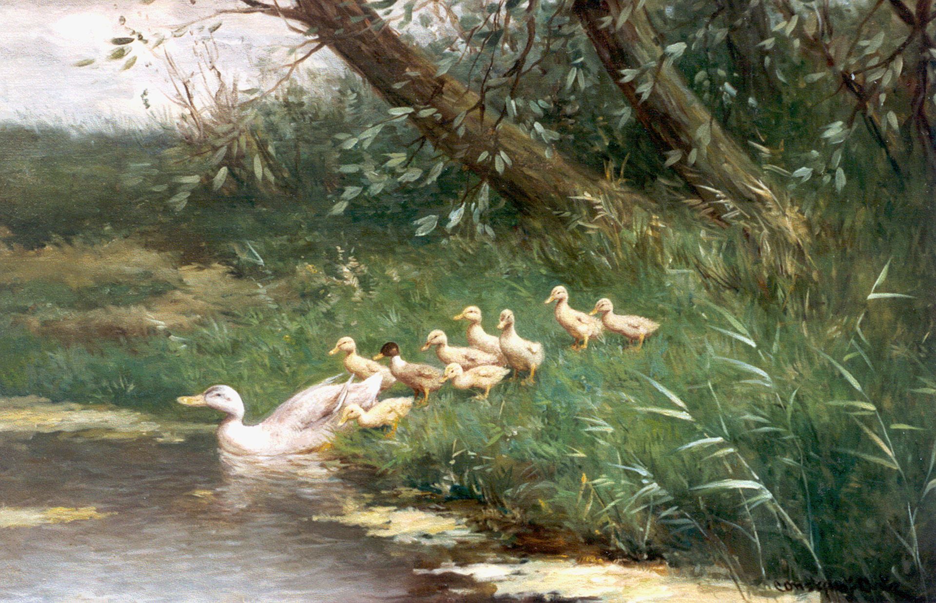 Constant Artz Kunstwerk • Gemälde • zuvor zu verkaufen A duck with ducklings watering