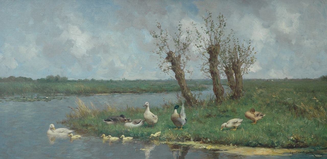 Constant Artz Kunstwerk • Gemälde • zuvor zu verkaufen A Dutch polder landscape with pollard willows and ducks