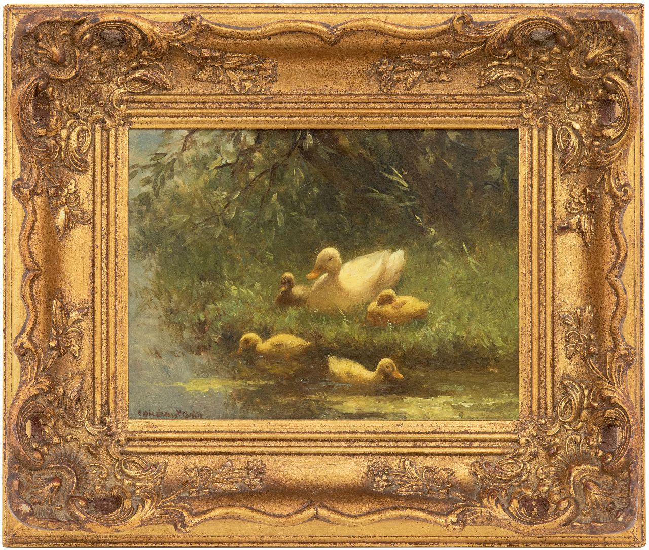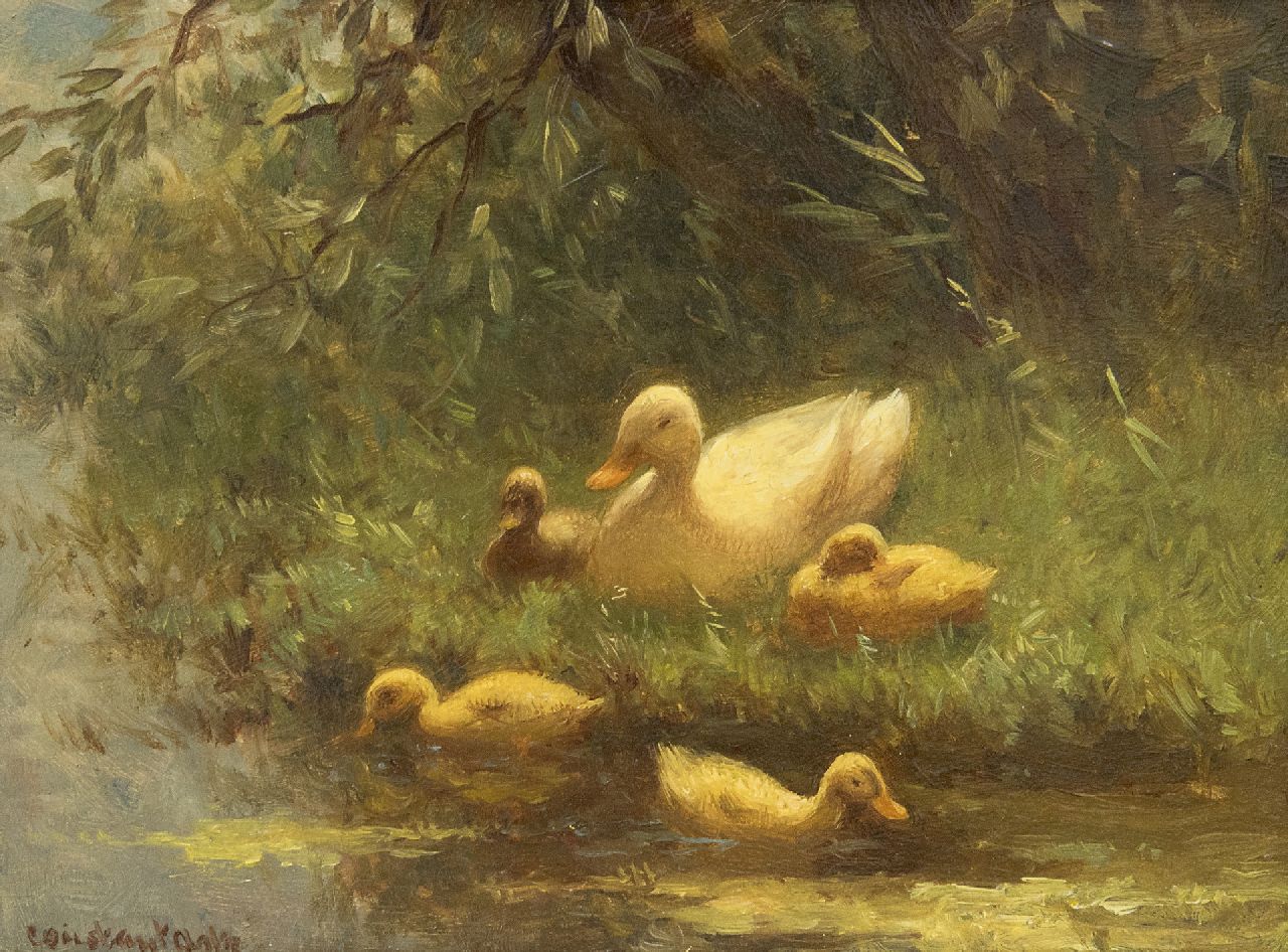 Constant Artz Kunstwerk • Gemälde • zuvor zu verkaufen Entenmutter mit Küken am Ufer