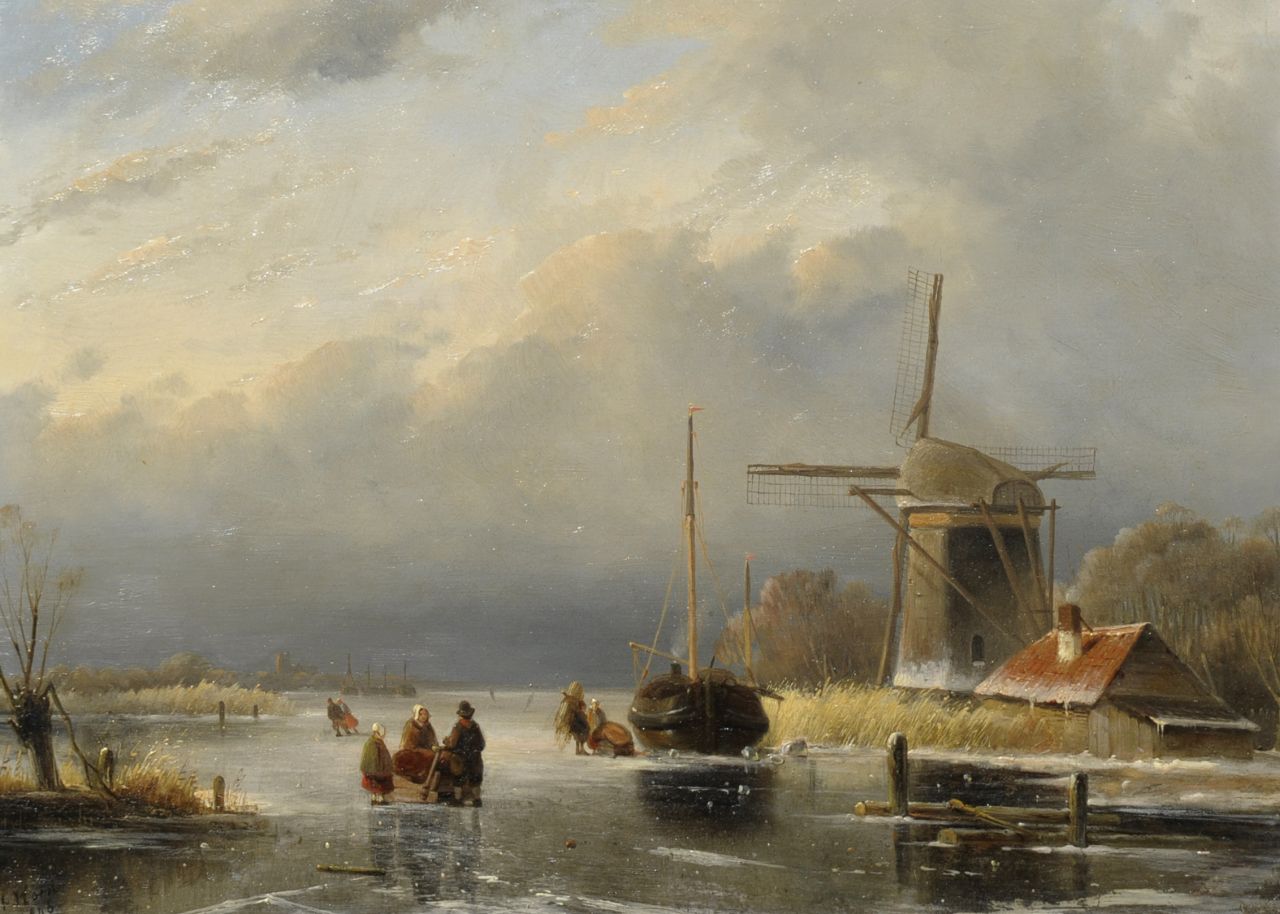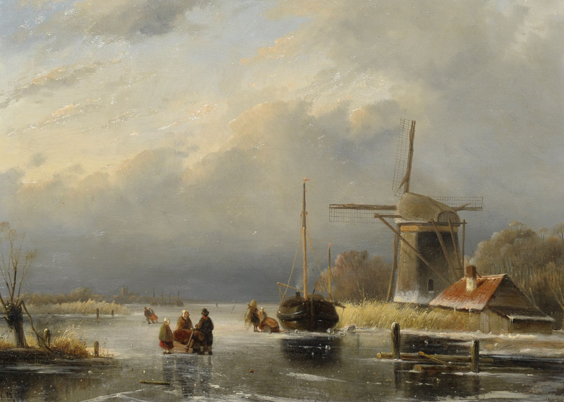 Hoen C.P. 't | Cornelis Petrus 't Hoen, A winter landscape with skaters by a windmill, Öl auf Holz 32,0 x 43,5 cm, signed l.l. und dated 1846