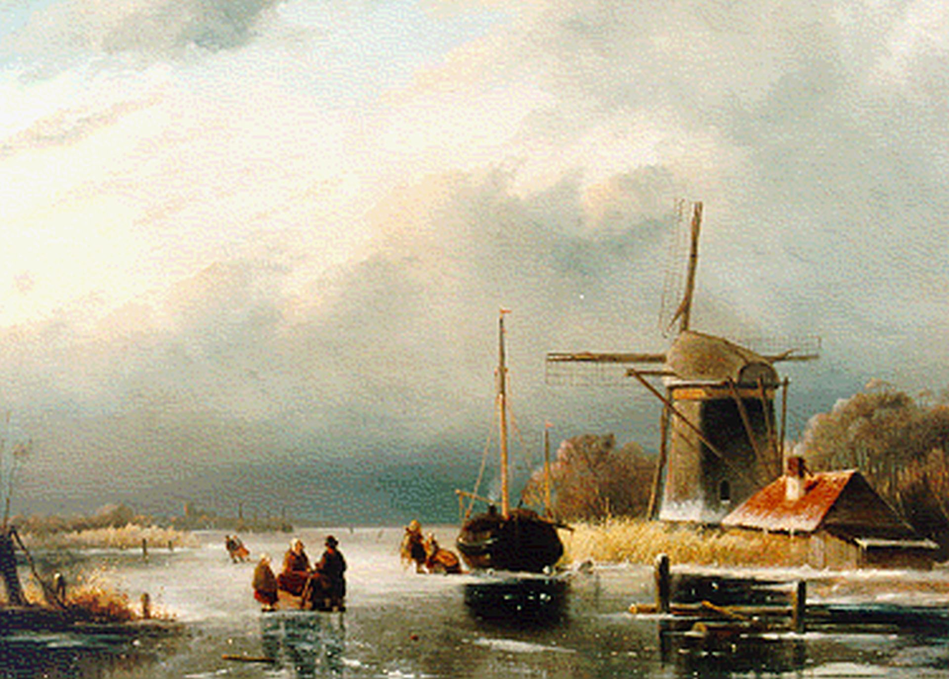 Cornelis Petrus 't Hoen Kunstwerk • Gemälde • zuvor zu verkaufen A winter landscape with skaters by a windmill
