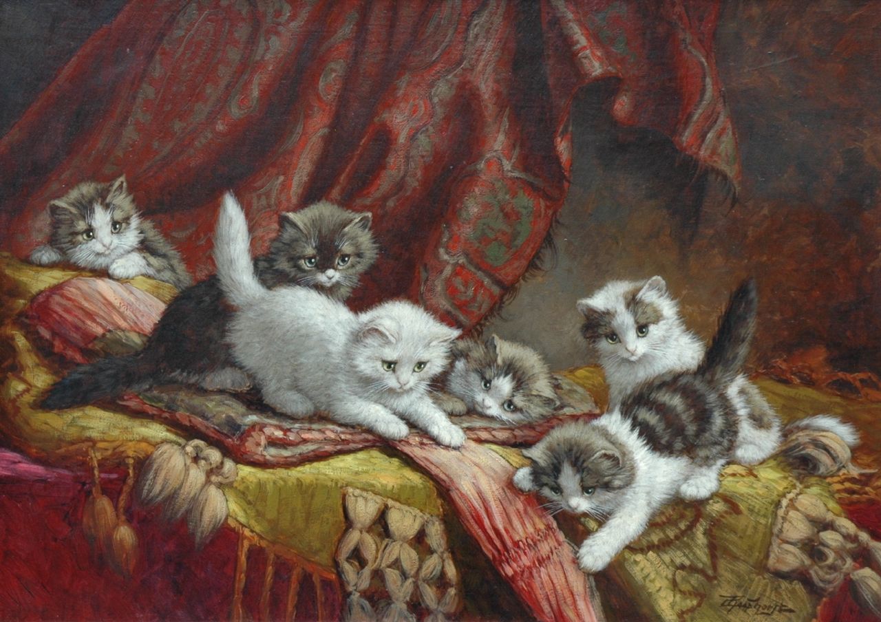 Cornelis Raaphorst Kunstwerk • Gemälde • zuvor zu verkaufen Six playing kittens on a pillow