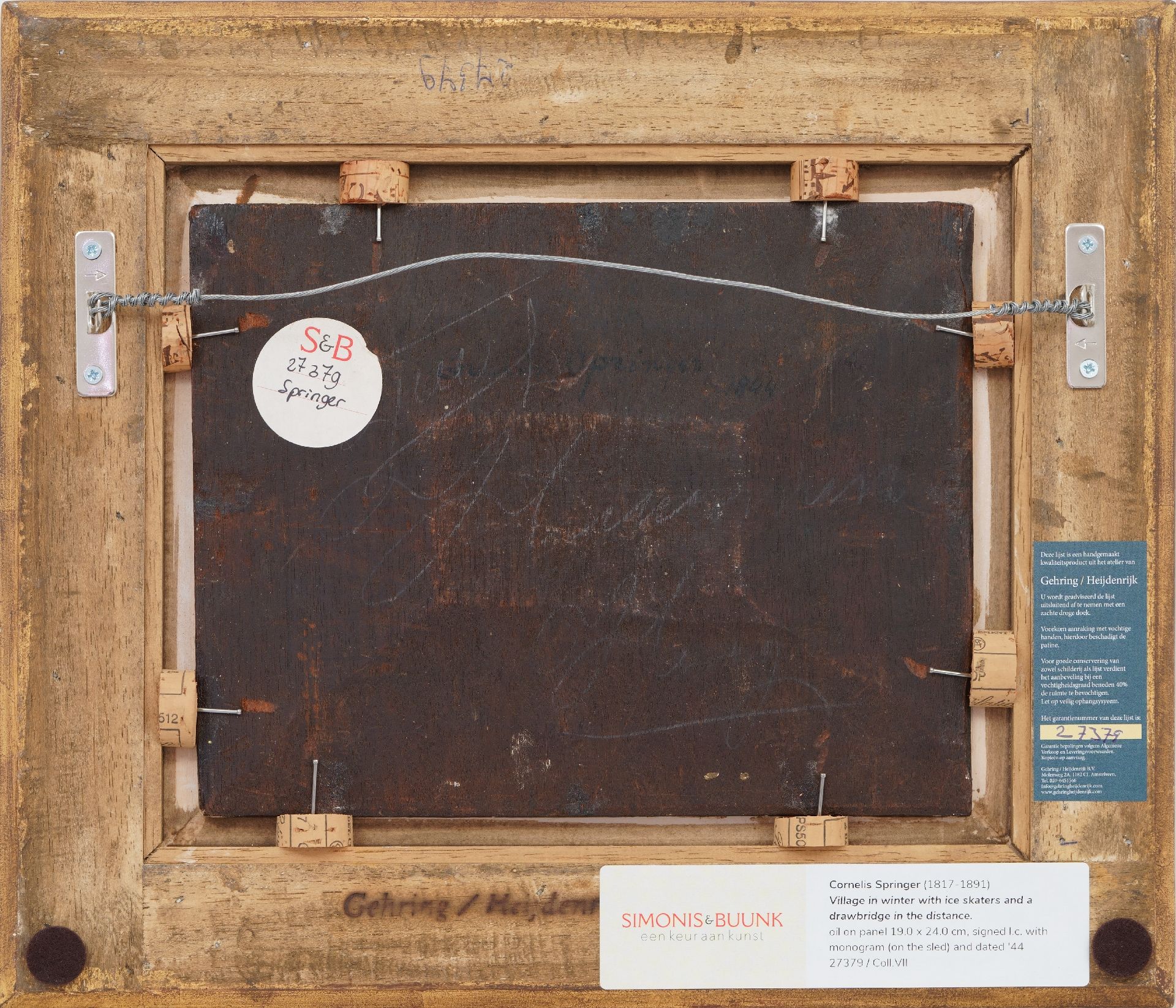 Cornelis Springer Kunstwerk • Gemälde • zuvor zu verkaufen Dorf im Winter mit Schlittschuhläufern und einer Zugbrücke in der Ferne