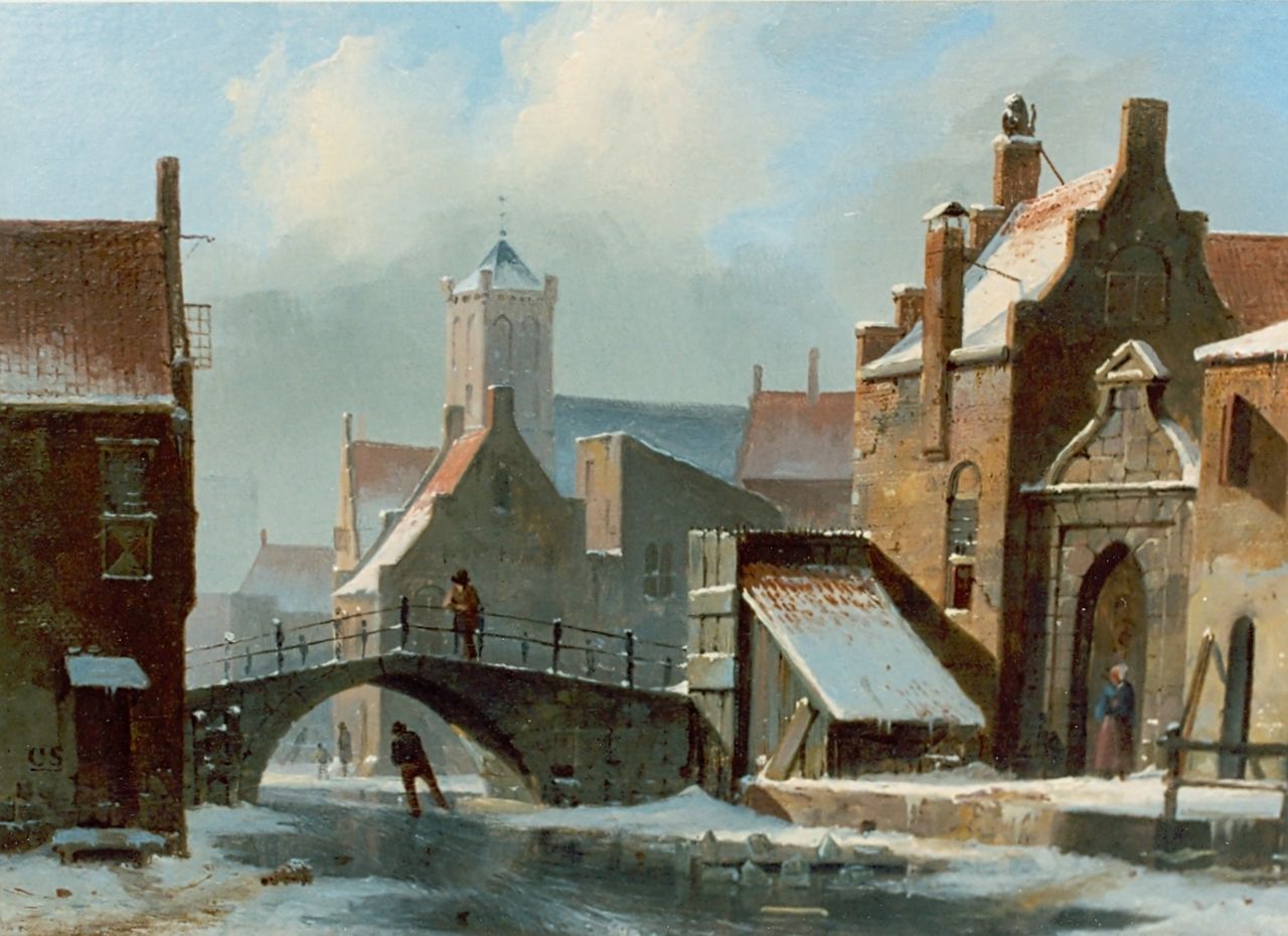 Cornelis Springer Kunstwerk • Gemälde • zuvor zu verkaufen A skater on a frozen canal