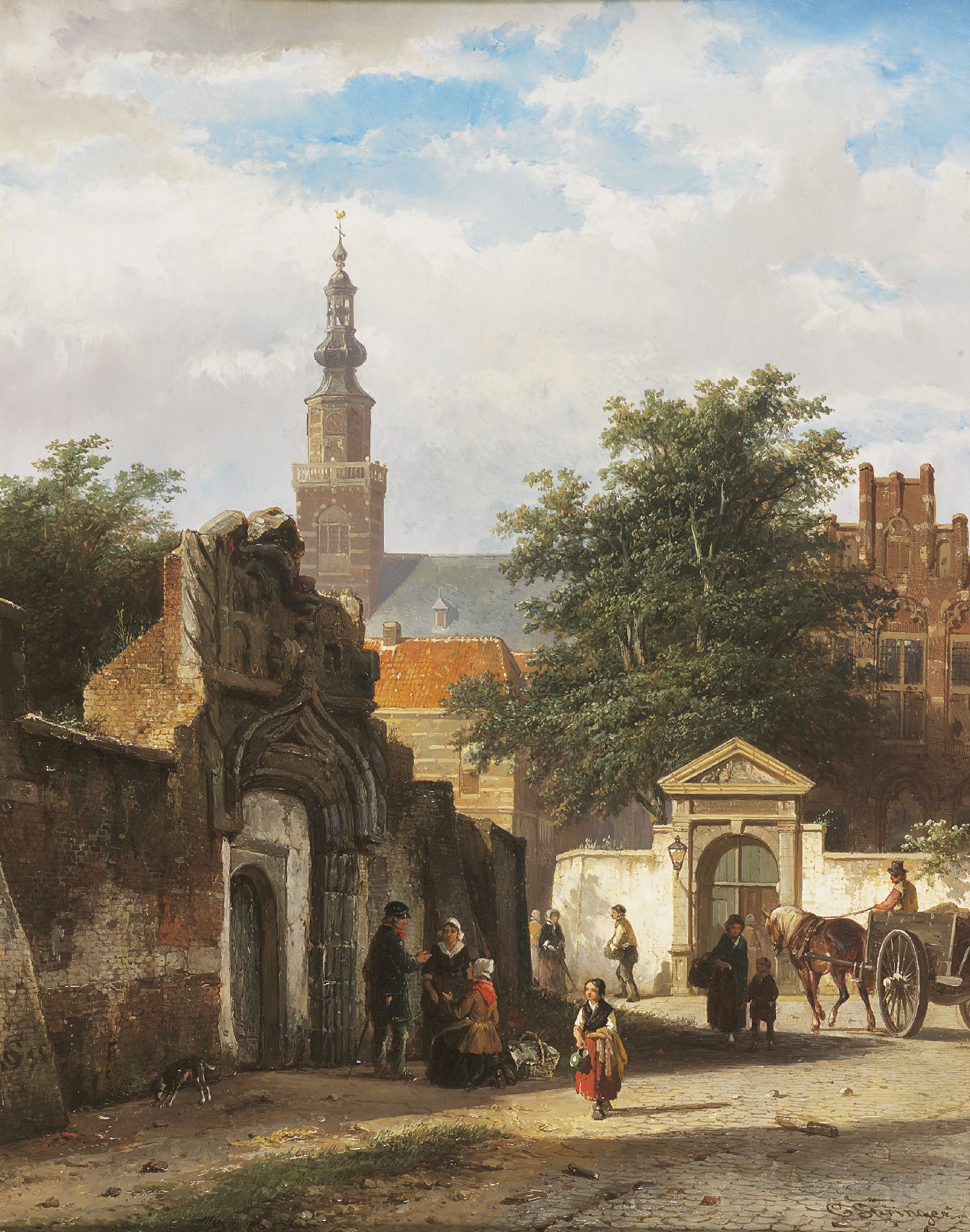 Cornelis Springer Kunstwerk • Gemälde • zuvor zu verkaufen At the entrance of the former St. Catharina convent in Brielle