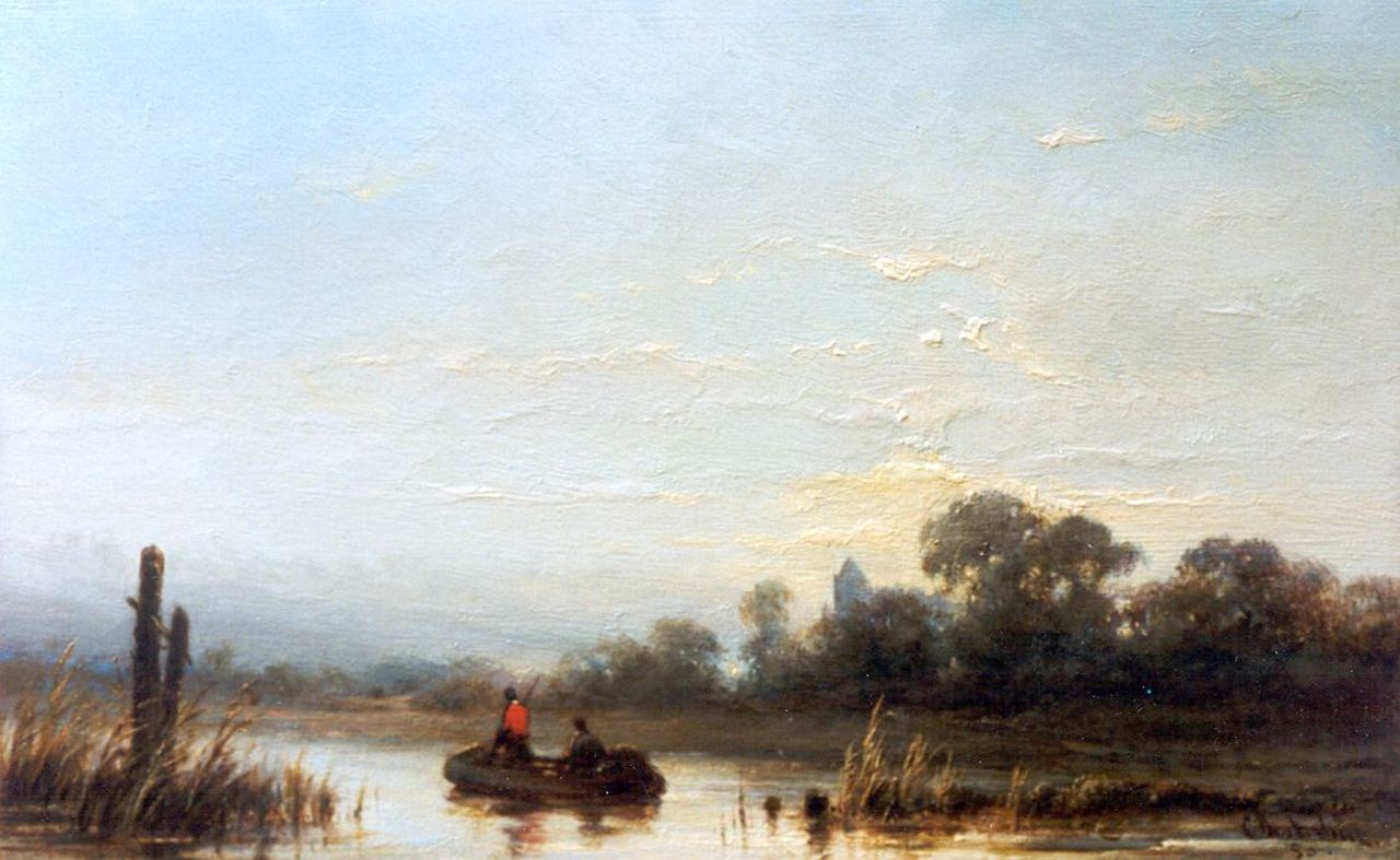 Cornelis Westerbeek Kunstwerk • Gemälde • zuvor zu verkaufen A river landscape with anglers in a boat