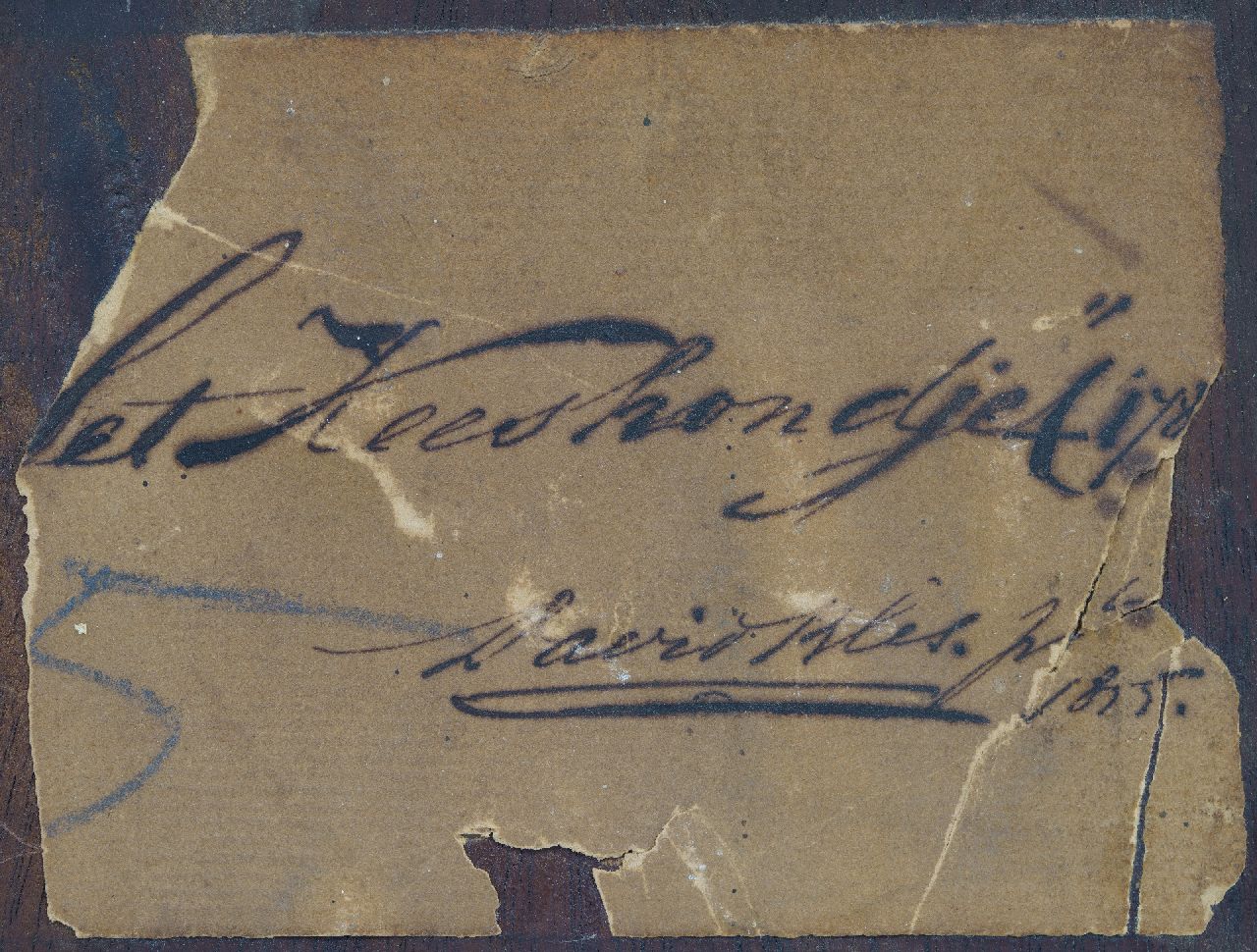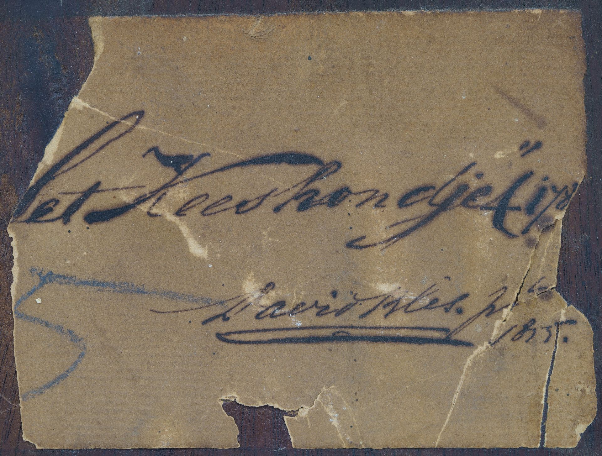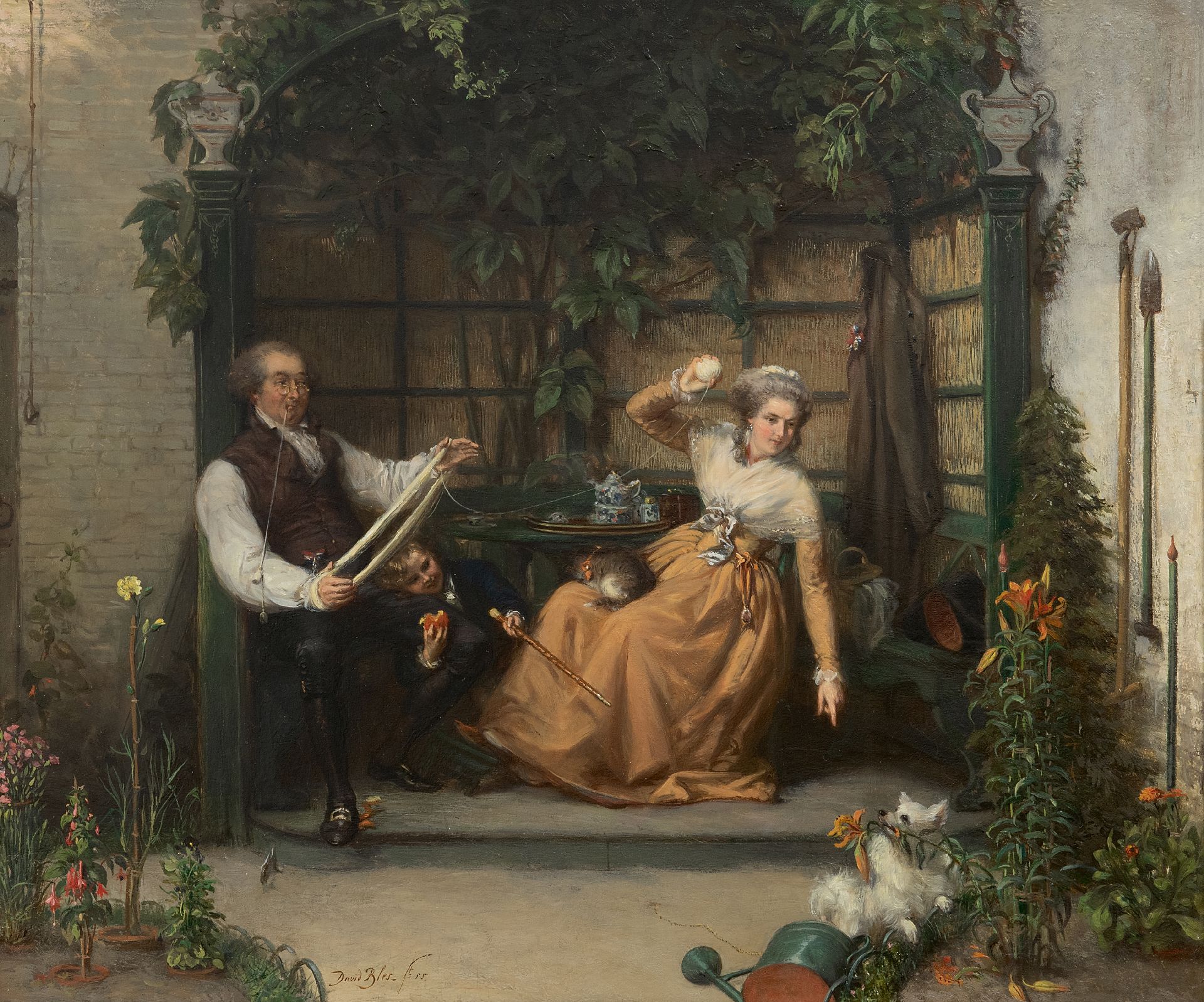 Ende des 18. Jahrhunderts stellten sich die Anhänger des Statthalters Wilhelm V von Oranje - Royalisten - den Patrioten entgegen, unzufriedene Bürger, die sich der Politik Wilhelms V widersetzten. Dieses Gemälde bezieht sich auf den Orangenen Geist der abgebildeten Familie. Da ist zum Beispiel ein Keeshondje, das Symbol der Patrioten, auch Kezen genannt, dessen Name wahrscheinlich von dem Patrioten Cornelis (Kees) de Gijselaaar abgeleitet ist. Der Hund wird von der Hausherrin für seinen 'Angriff' auf die orangefarbenen Lilien im Blumenbeet gerügt, die Mutter streckt tadelnd den Finger aus und der Sohn folgt ihrem Beispiel mit einem Stock. An ihrem Rock hängt ein orangefarbenes Band mit einem Medaillon, das wahrscheinlich Wilhelm V. darstellt. Am Revers des Mantels des Hausherrn sowie in seiner Westentasche ist eine rot-weiß-blaue Schleife gebunden. Sohn beißt in eine Orange, ein Stück Schale liegt auf dem Boden. Sogar die Katze ist königlich mit einem orangefarbenen Band geschmückt.