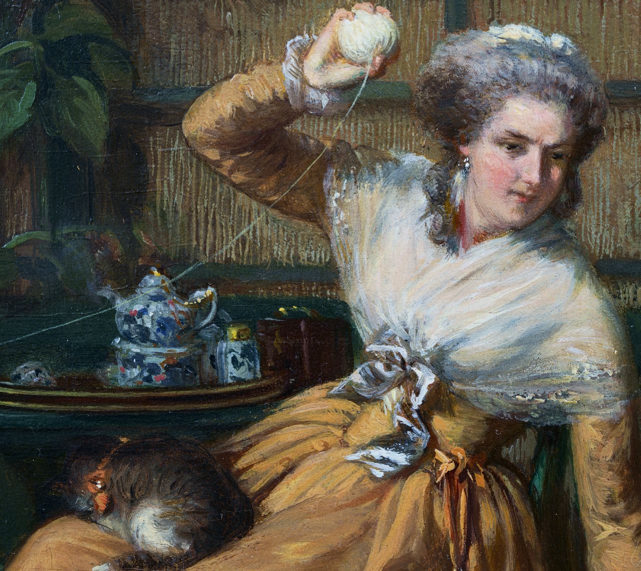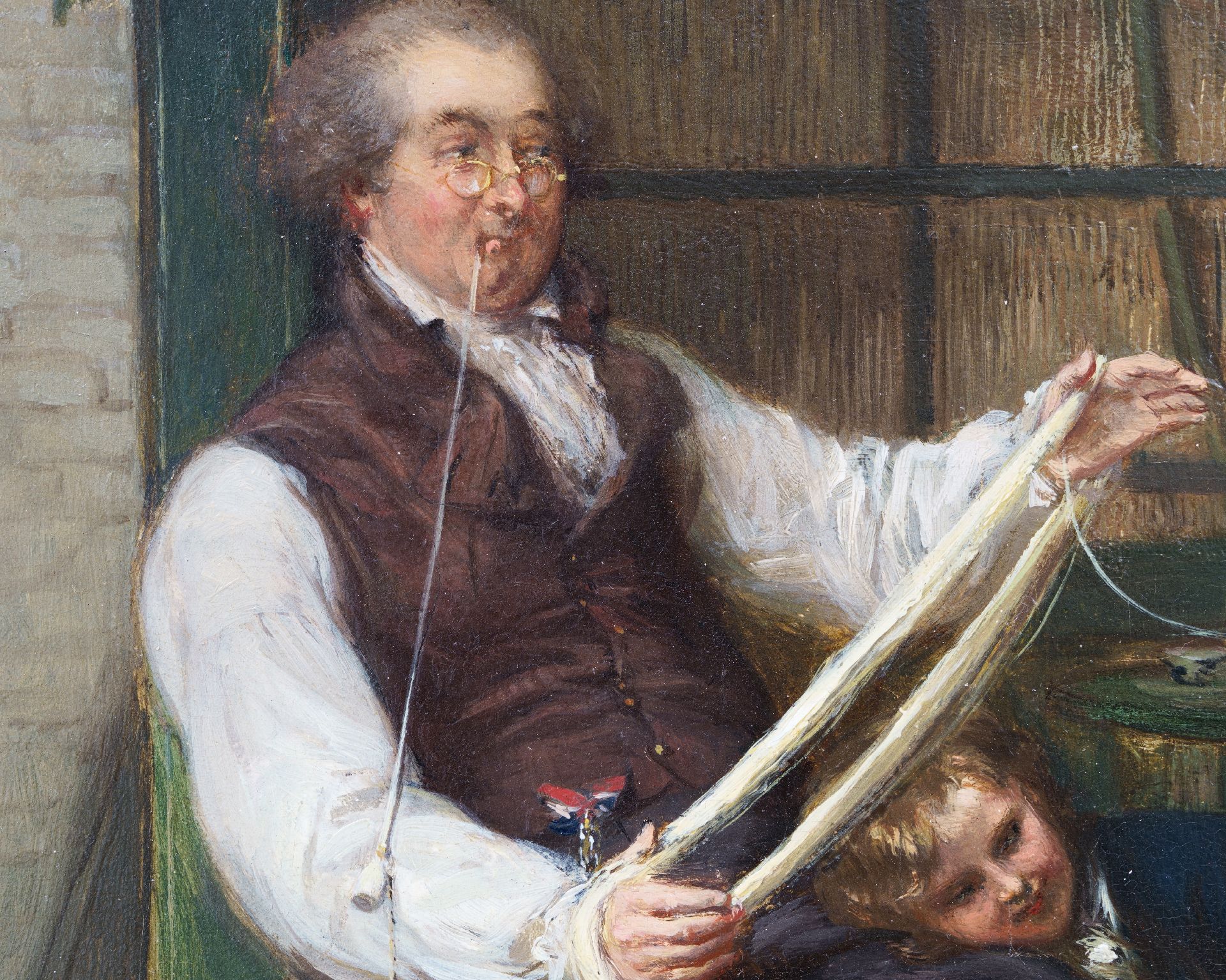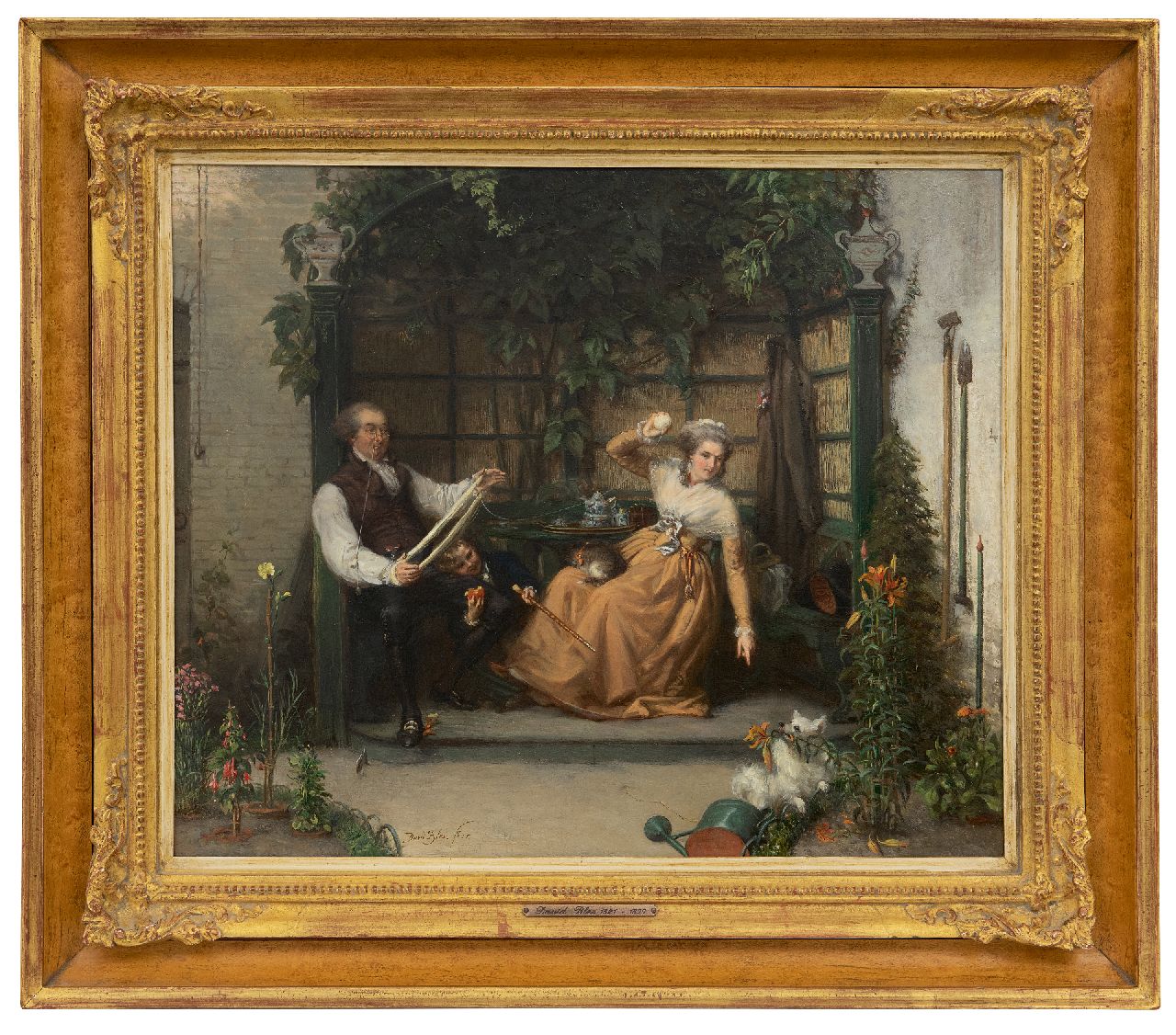 Ende des 18. Jahrhunderts stellten sich die Anhänger des Statthalters Wilhelm V von Oranje - Royalisten - den Patrioten entgegen, unzufriedene Bürger, die sich der Politik Wilhelms V widersetzten. Dieses Gemälde bezieht sich auf den Orangenen Geist der abgebildeten Familie. Da ist zum Beispiel ein Keeshondje, das Symbol der Patrioten, auch Kezen genannt, dessen Name wahrscheinlich von dem Patrioten Cornelis (Kees) de Gijselaaar abgeleitet ist. Der Hund wird von der Hausherrin für seinen 'Angriff' auf die orangefarbenen Lilien im Blumenbeet gerügt, die Mutter streckt tadelnd den Finger aus und der Sohn folgt ihrem Beispiel mit einem Stock. An ihrem Rock hängt ein orangefarbenes Band mit einem Medaillon, das wahrscheinlich Wilhelm V. darstellt. Am Revers des Mantels des Hausherrn sowie in seiner Westentasche ist eine rot-weiß-blaue Schleife gebunden. Sohn beißt in eine Orange, ein Stück Schale liegt auf dem Boden. Sogar die Katze ist königlich mit einem orangefarbenen Band geschmückt.