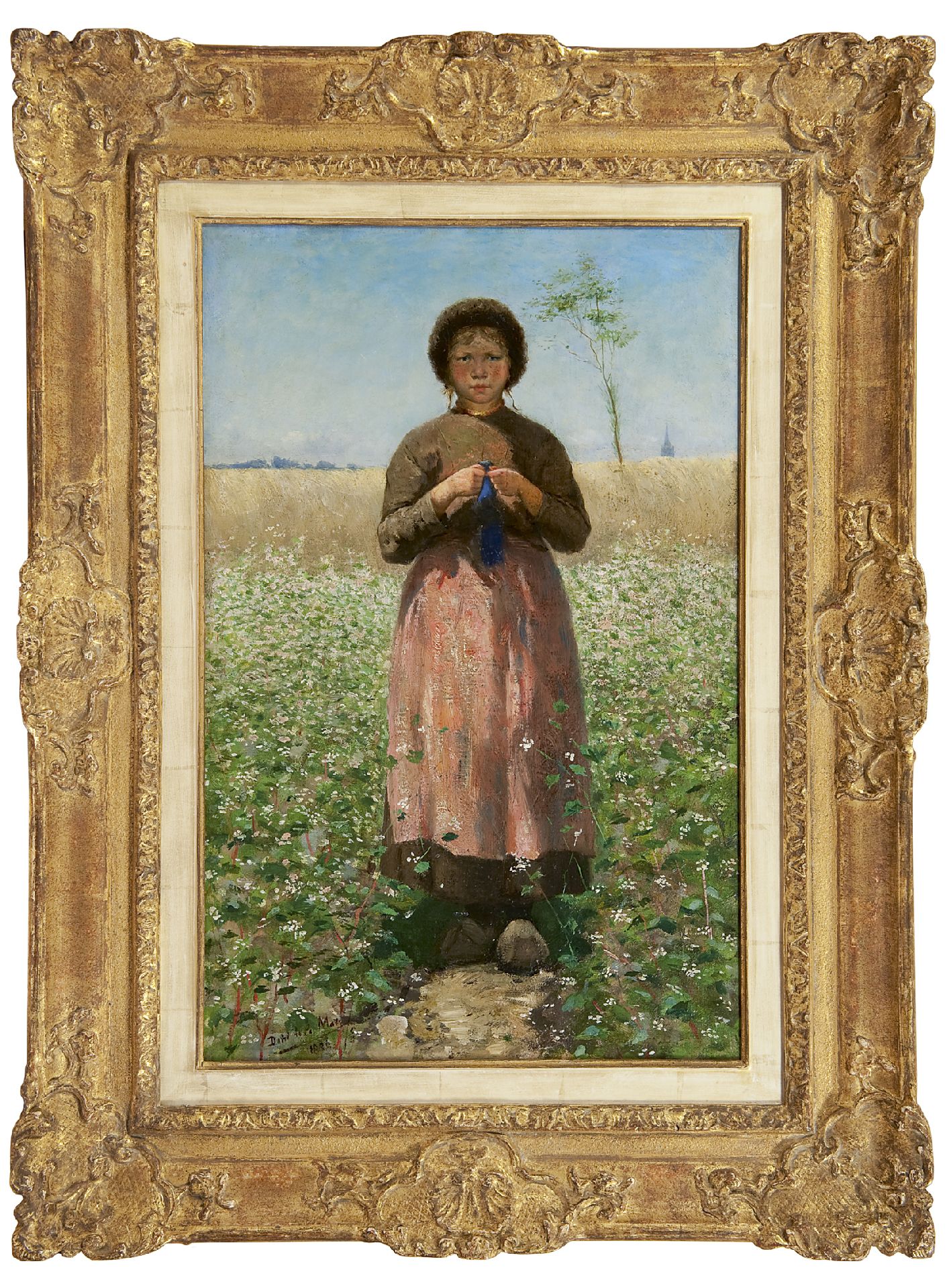 David de la Mar Kunstwerk • Gemälde • zuvor zu verkaufen A knitting peasant girl in a flowering buckwheat field