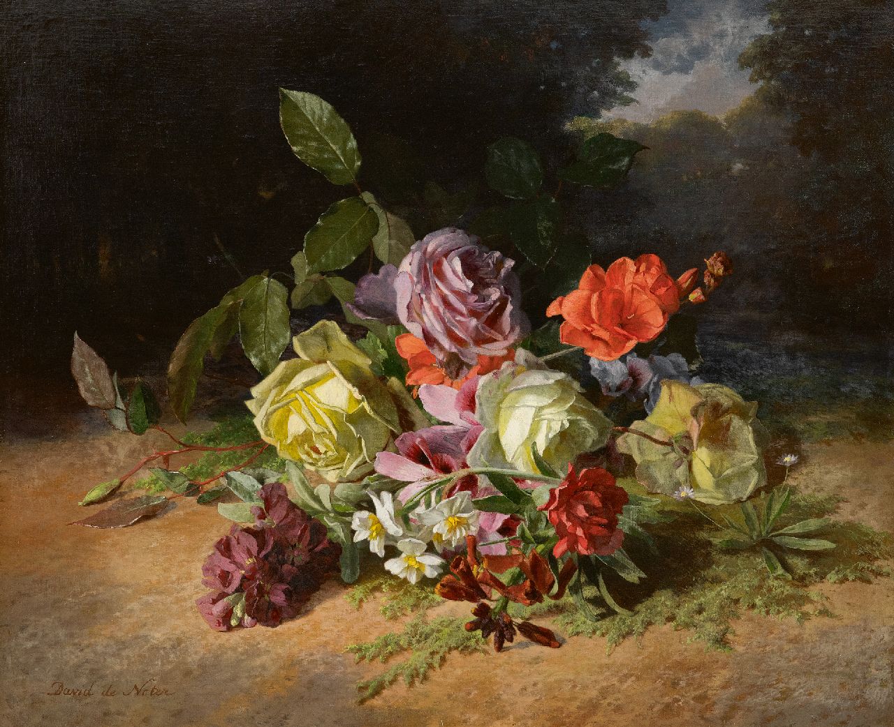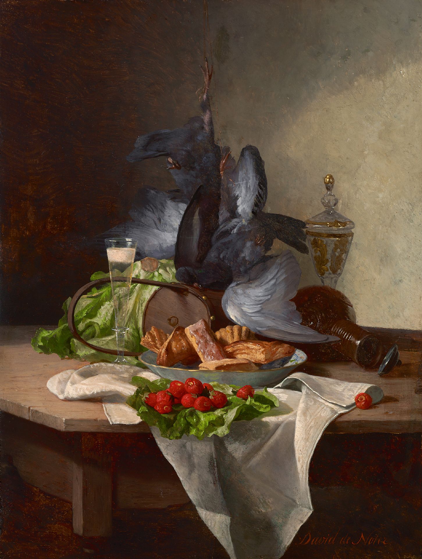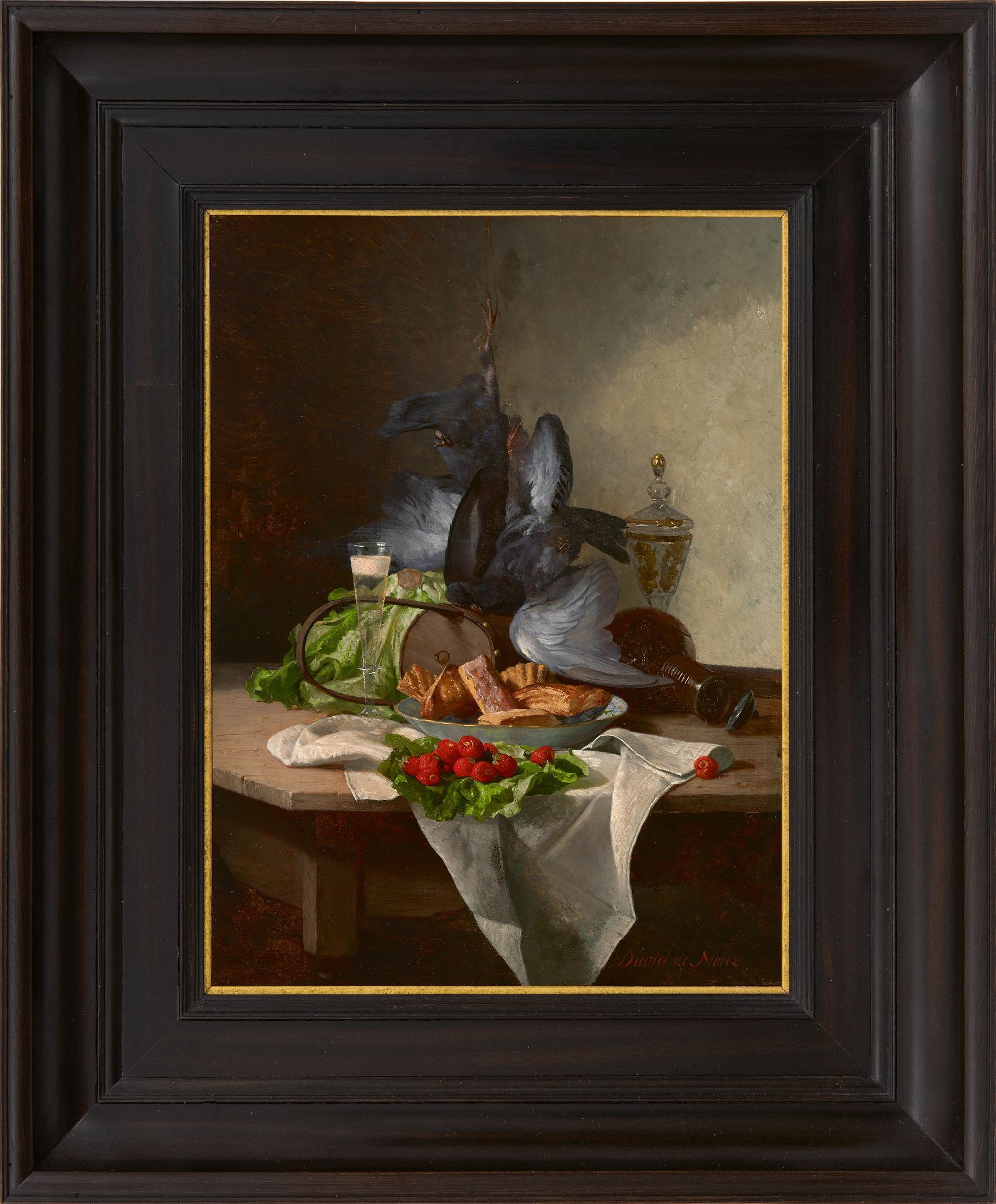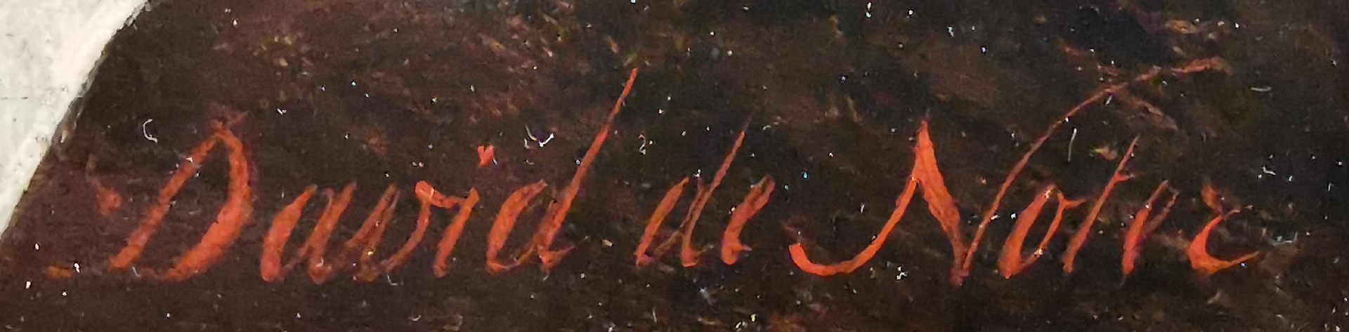 Der belgische David de Noter bevorzugte Innenräume, Genreszenen und Stilleben mit Blumen, Früchten und/oder Wild. Das Metier lernte er von seinem Vater Jean-Baptiste André de Noter, Maler von Stadtansichten und Innenräumen. Er ließ sich 1840 in Brüssel nieder, wohnte auch regelmäßig in Paris. De Noter arbeitete zusammen mit Jean Auguste Henri Leys aus Antwerp: er malte auf eine Anzahl von Leys' Gemälden die Blumen, Gemüse oder Früchte. Und Leys malte die Figuren auf manche Gemälde von De Noter. Das Vergeben der Malerei von Menschen,Tieren, Gebäuden und übrigen Beifügungen einem anderen war damals üblich bis tief in das 19. Jahrhundert. Spezialisierung, das sich Verlegen auf ein bestimmtes Genre in der Malerei löste diesen Brauch aus: Porträtmaler, Maler von Blumen und Stilleben, Viehmaler, Marinemaler und Landschaftsmaler benutzten wonötig einanders spezifische Fähigkeiten..