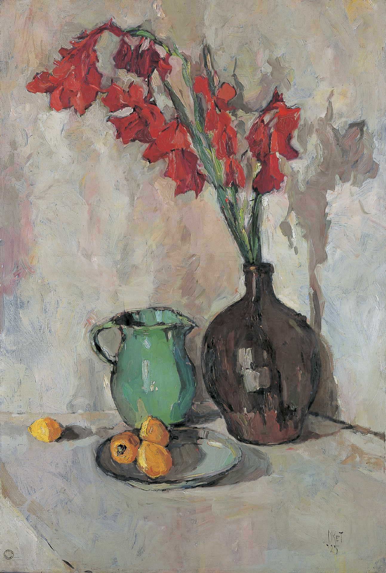 Dick Ket Kunstwerk • Gemälde • zuvor zu verkaufen Still life with red gladiolus in a brown jar and lemons